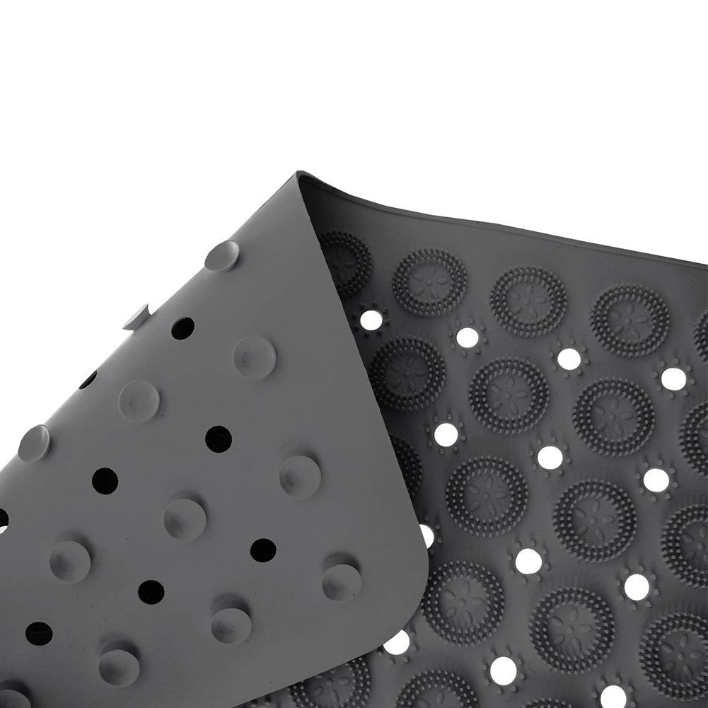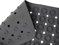 Az alátét tartós, nedvességálló anyagból készült, elegáns szürke színben, amely könnyedén illeszkedik modern és klasszikus fürdőszobákba egyaránt. Zuhanykabinba, kádba és zuhanytálca aljára is alkalmas, a nyílásnak köszönhetően pedig használat után kényelmesen felakasztható és megszárítható.