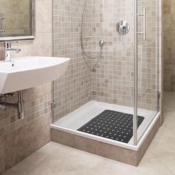 A felület egészén elhelyezett több tucat tapadókorong biztosítja a szilárd rögzítést a zuhanyzó vagy kád sima felületéhez, és minimalizálja az elcsúszás kockázatát.