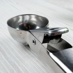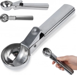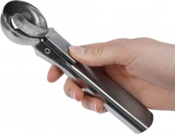 Ez a rozsdamentes acél fagylaltadagoló kanál gyors és precíz adagolásra készült. Masszív fém kivitelének köszönhetően tálalás közben nem hajlik meg, a beépített karos kioldó pedig gondoskodik róla, hogy a gombócokat a tálból tisztán, ragadás nélkül engedje el.