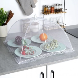 Praktikus, összecsukható élelmiszervédő háló 45 × 45 × 29 cm méretben, amely megbízhatóan védi az ételeket és italokat a rovaroktól otthon és a szabadban. A finom hálószövet biztosítja a szabad légáramlást, az esernyő stílusú, könnyű fémváz pedig gyors fel- és összecsukást tesz lehetővé, miközben alig foglal helyet. Ideális a konyhába, étkezőbe, teraszra, grillezéshez és piknikhez.