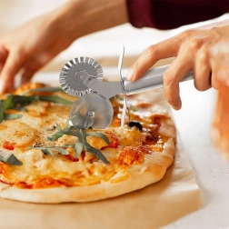 Univerzális, rozsdamentes acél tésztavágó két vágókerékkel a házi tészták, ravioli, kekszek és sós krékerek elkészítésének megkönnyítésére. A sima kerék tökéletesen egyenesen vág, míg a dekoratív hullámos kerék látványos, recés széleket hoz létre, és egyúttal segít lezárni a széleket batyuknál vagy raviolinál.