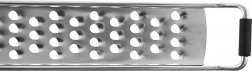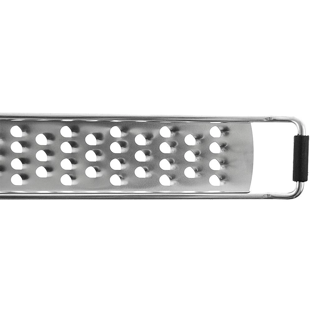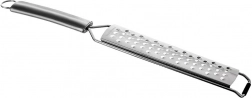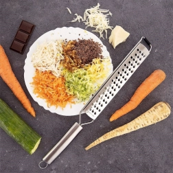 Praktikus rozsdamentes acél reszelő keskeny, lapos pengével és éles fogakkal, melyekkel gyorsan és egyenletesen reszelhet alapanyagokat finom vagy közepes forgácsokra. A hosszú ergonomikus nyél biztos fogást és pontos irányítást ad munka közben, míg a gumis talp megóvja a lábosokat és serpenyőket a karcolódástól.
