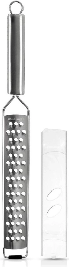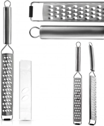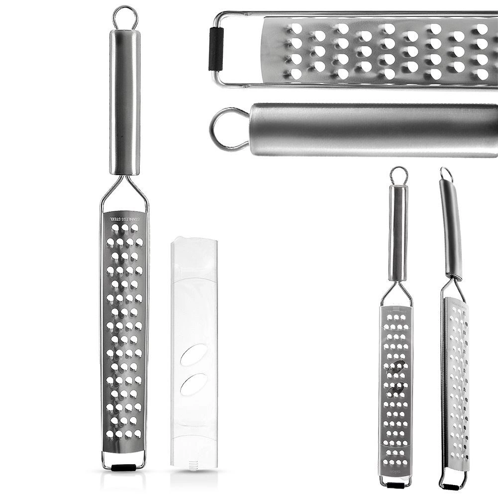 A reszelő kiváló kemény sajtokhoz, gyökérzöldségekhez, fokhagymához, diófélékhez, valamint citrushéjhoz, csokoládéhoz és fűszerekhez, mint a fahéj, gyömbér vagy szerecsendió. A tartozék védőtok biztonságos fiókos tárolást tesz lehetővé más eszközök sérülése nélkül. Tartós rozsdamentes acélból készült a könnyű karbantartás és a hosszú élettartam érdekében.