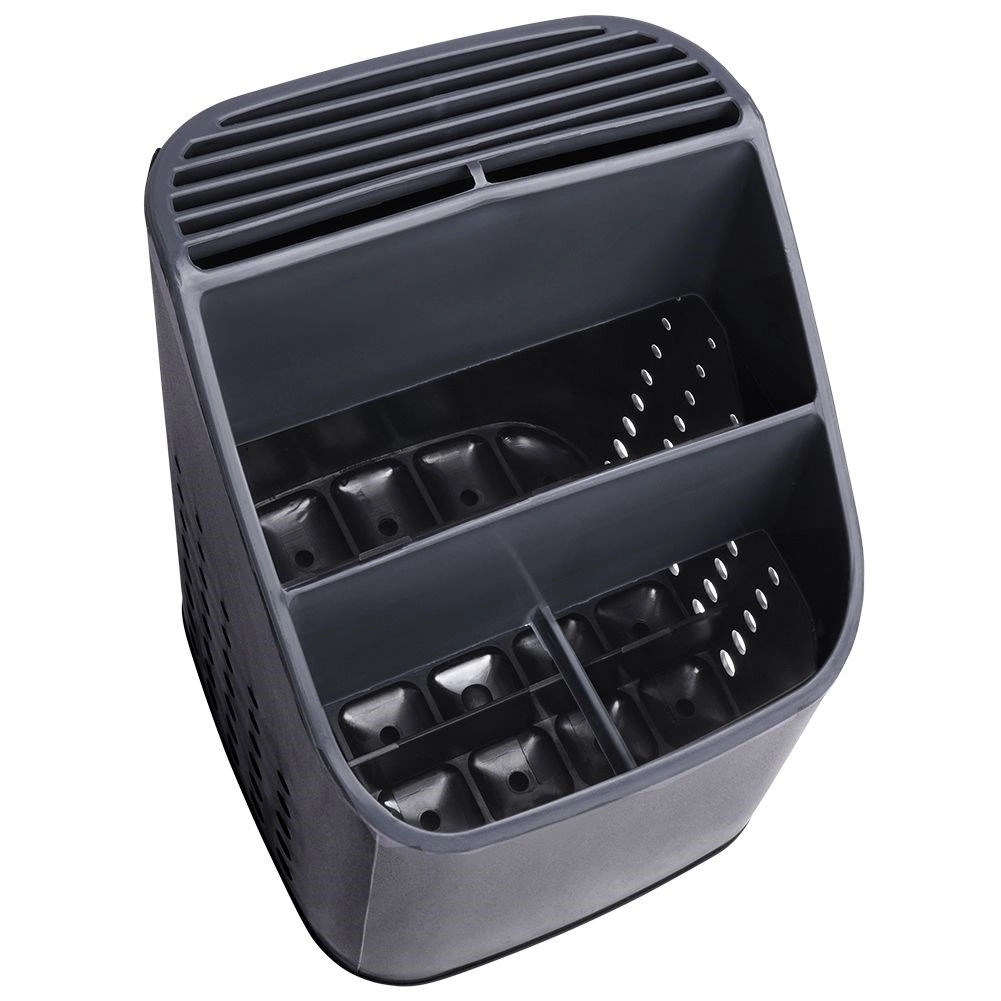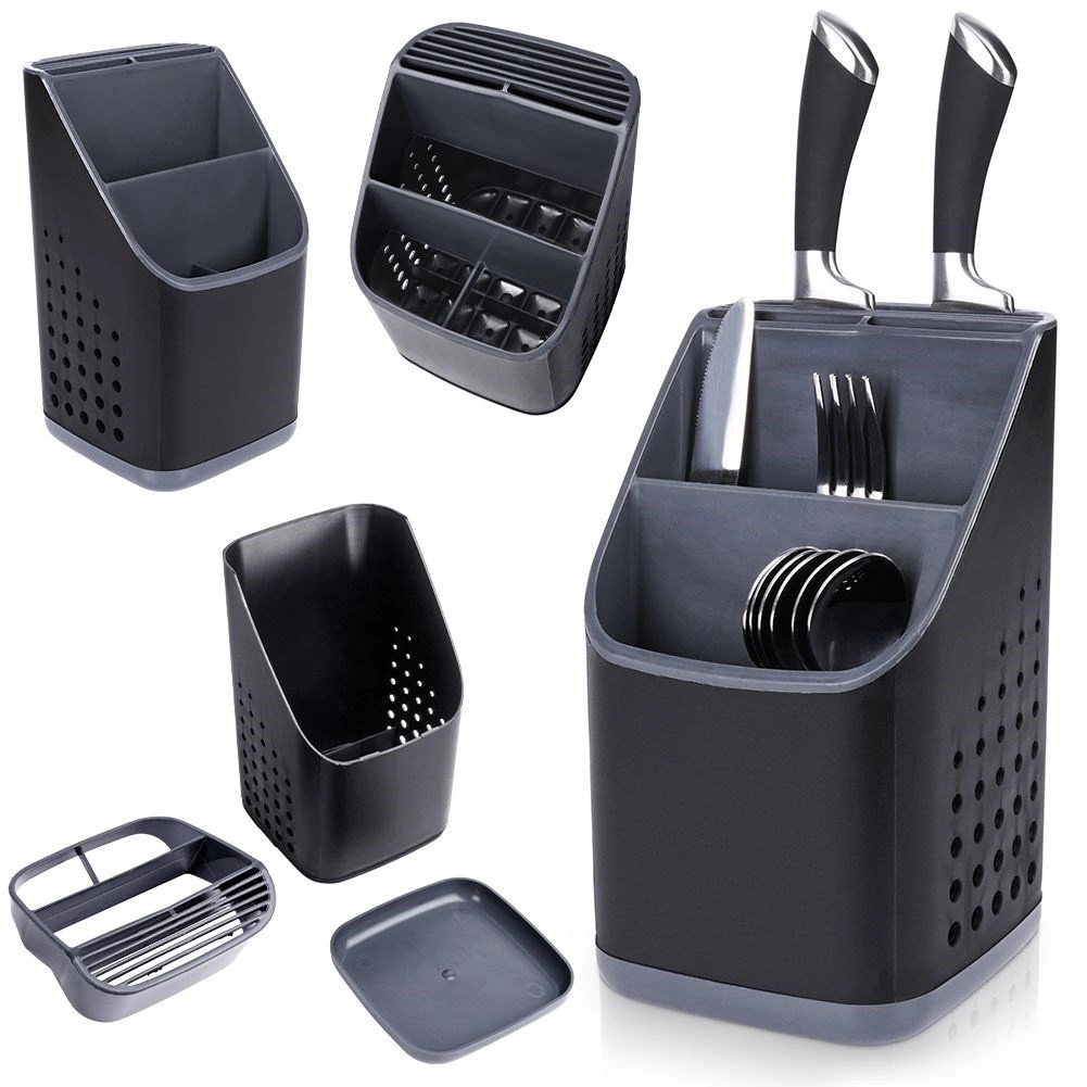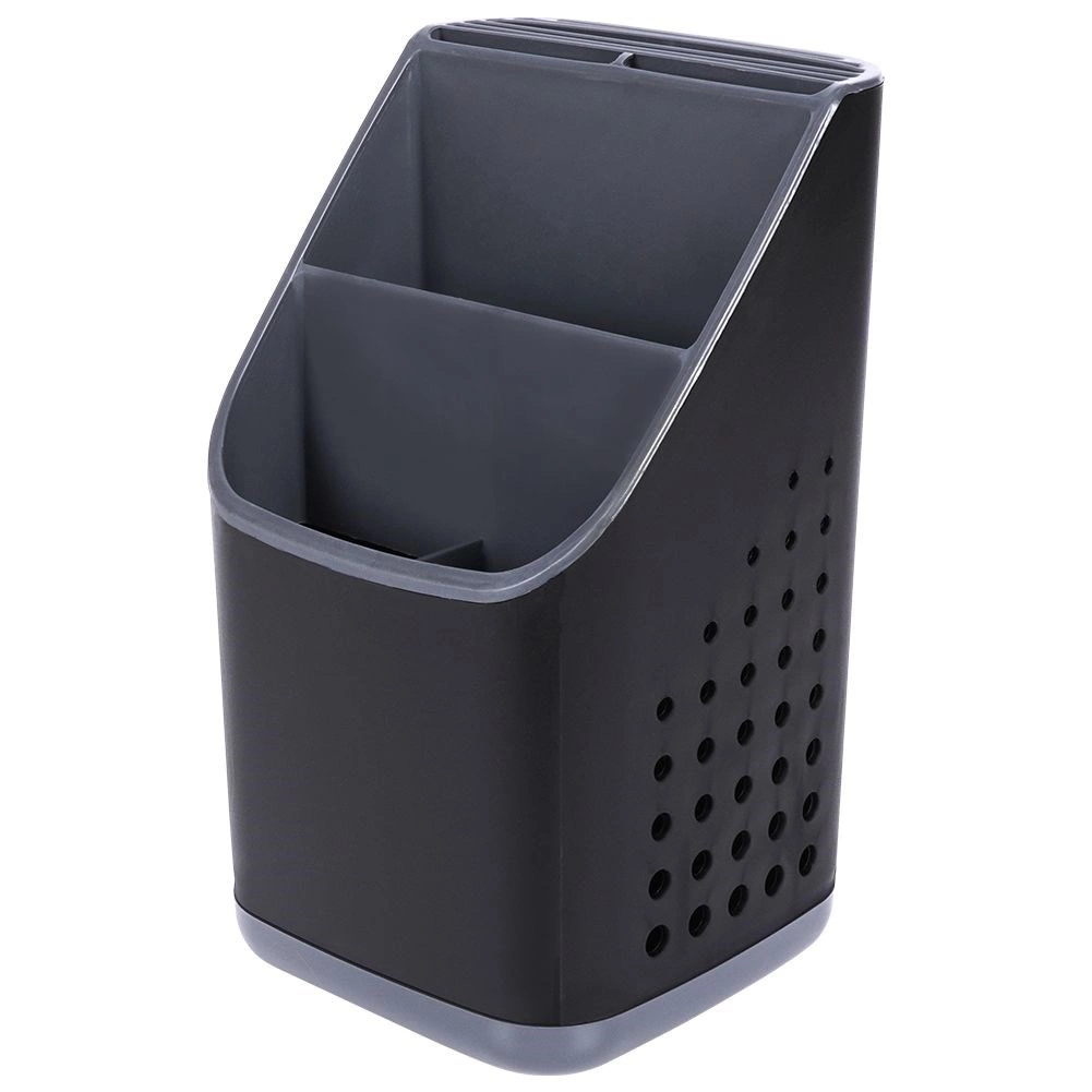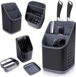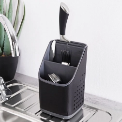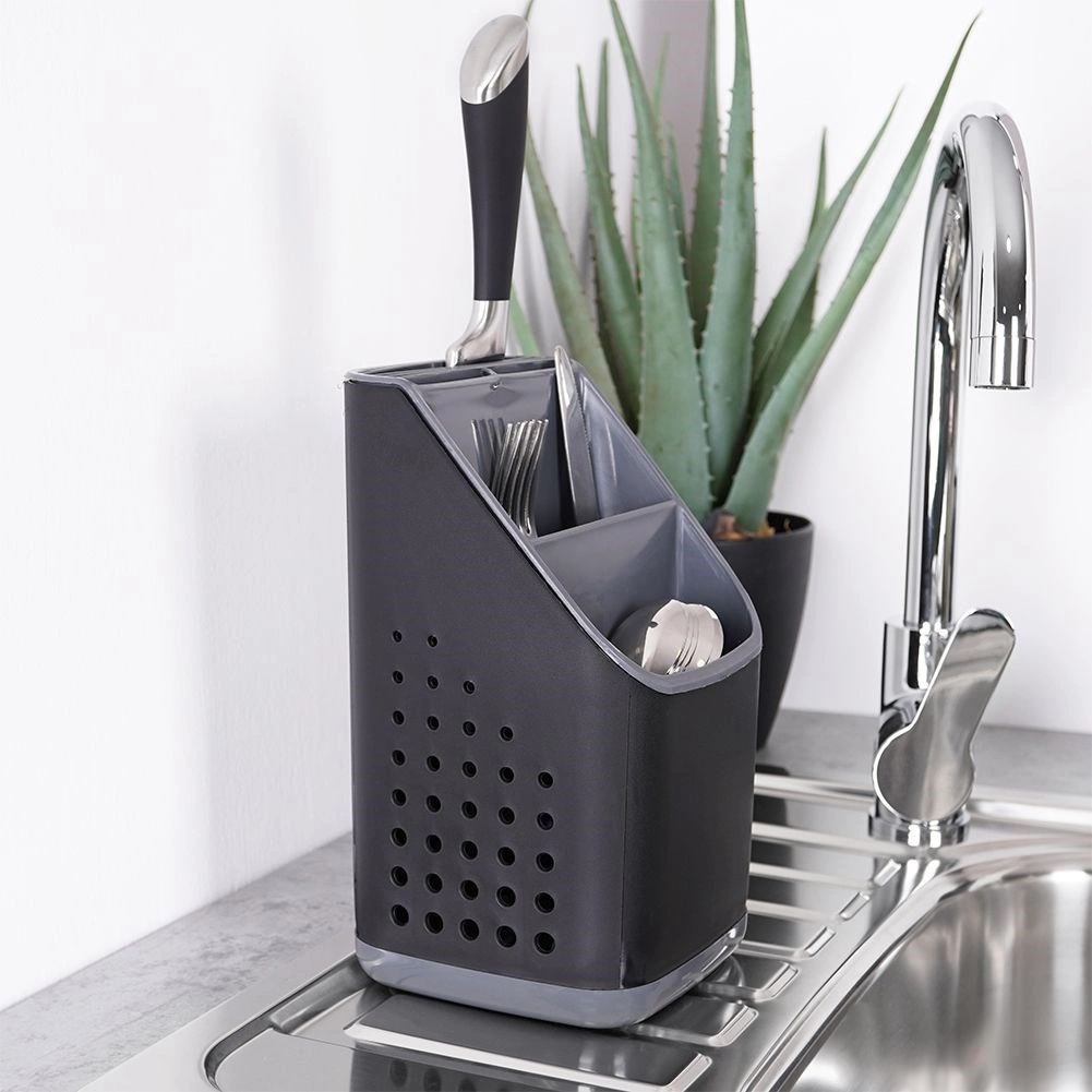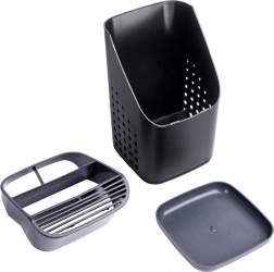 A kiváló minőségű műanyag fekete színben, grafitszürke részletekkel modern hatást kelt, és a legtöbb konyhába illik. A belső rendező eltávolításával egy tágas, egyrekeszes tartályt kap, például nagyobb eszközökhöz. Kompakt méretének köszönhetően elfér a csurgatón vagy a munkalapon, és nem zavaró.