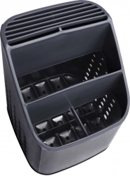 A felső, résekkel ellátott tartó függőlegesen és az evőeszközöktől elkülönítve tartja a késeket a biztonságosabb kezelés és a gyorsabb száradás érdekében.