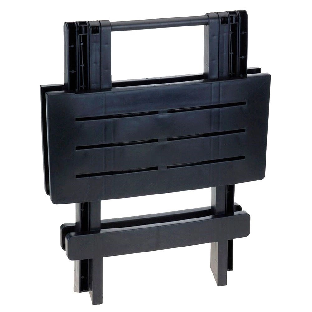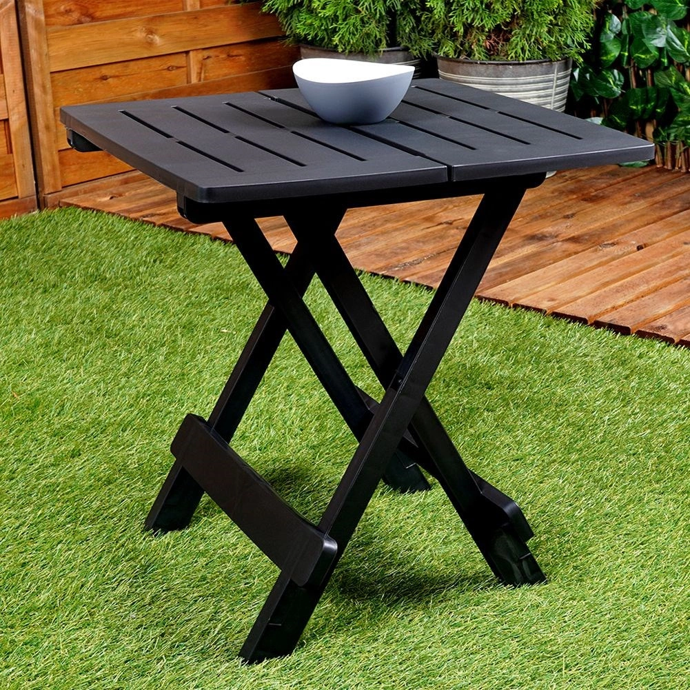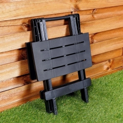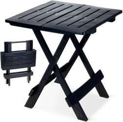 Kompakt, összecsukható kerti asztal elegáns fekete színben, ideális kertbe, erkélyre és kempingezéshez. Az asztallap mérete 44 × 44 cm, magassága 50 cm, teherbírása akár 12 kg. Könnyű, időjárásálló és vízálló. A gyors összecsukásnak és a praktikus fogantyúnak köszönhetően könnyen hordozható és minimális helyet foglal.