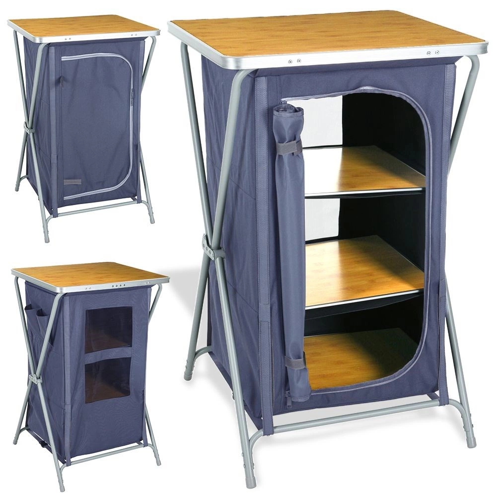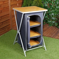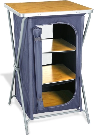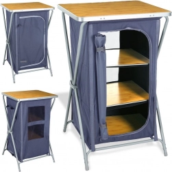 Praktikus kempingszekrény stabil acélvázzal, tartós textillel és fa hatású MDF lappal. Kínál három tágas polcot, gyors össze- és szétnyitást, cipzáras zárást és könnyű szállítást hordtáskával. Ideális kempingezéshez, lakóautóba és sátorba.