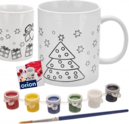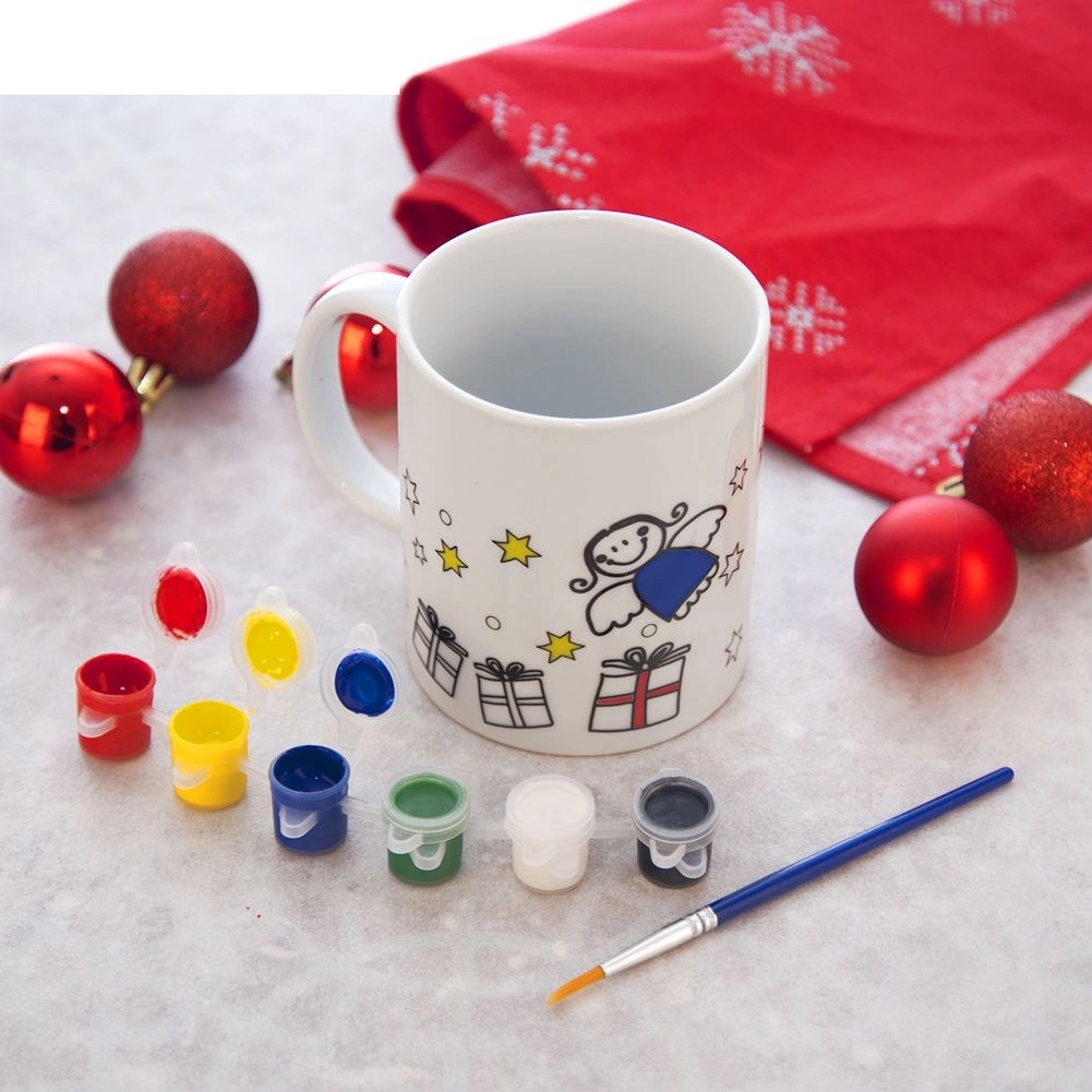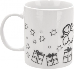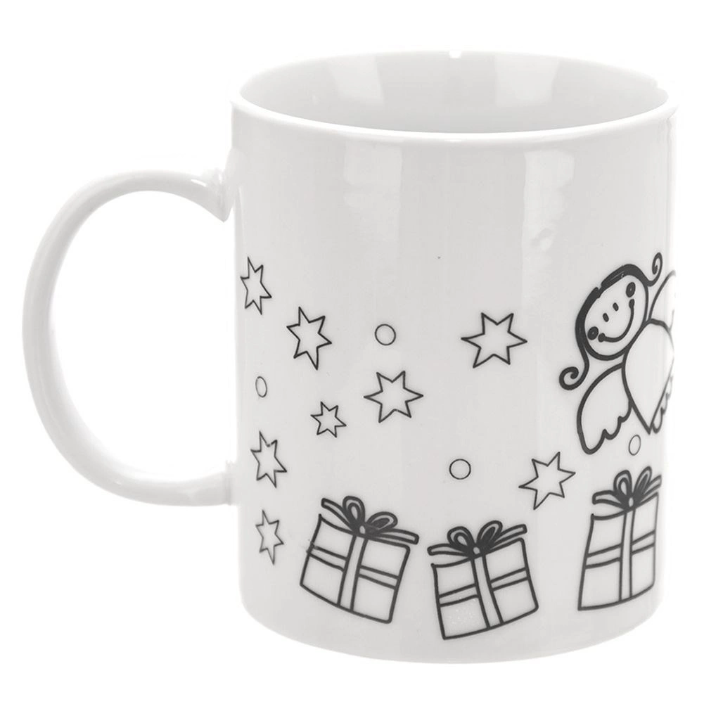 Alkossa meg saját karácsonyi bögréjét! Ez a kiszínezhető porcelán bögre 350 ml űrtartalommal előrenyomtatott körvonalakkal rendelkezik: fenyőfa, ajándékok, csillagok és angyalka, a csomagban pedig ecsetet és 6 akrilfestéket talál. A bögre mosogatógépben mosható és mikrózható, a sütőben történő kiégetés után pedig sokáig megőrzi élénk színeit.