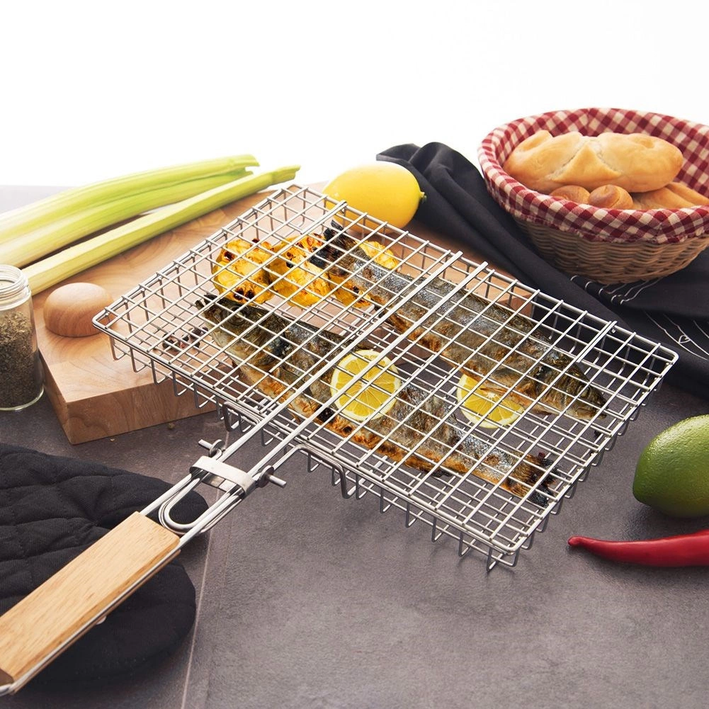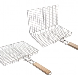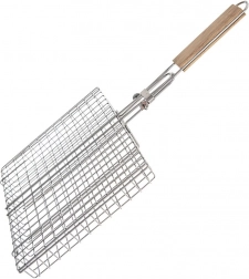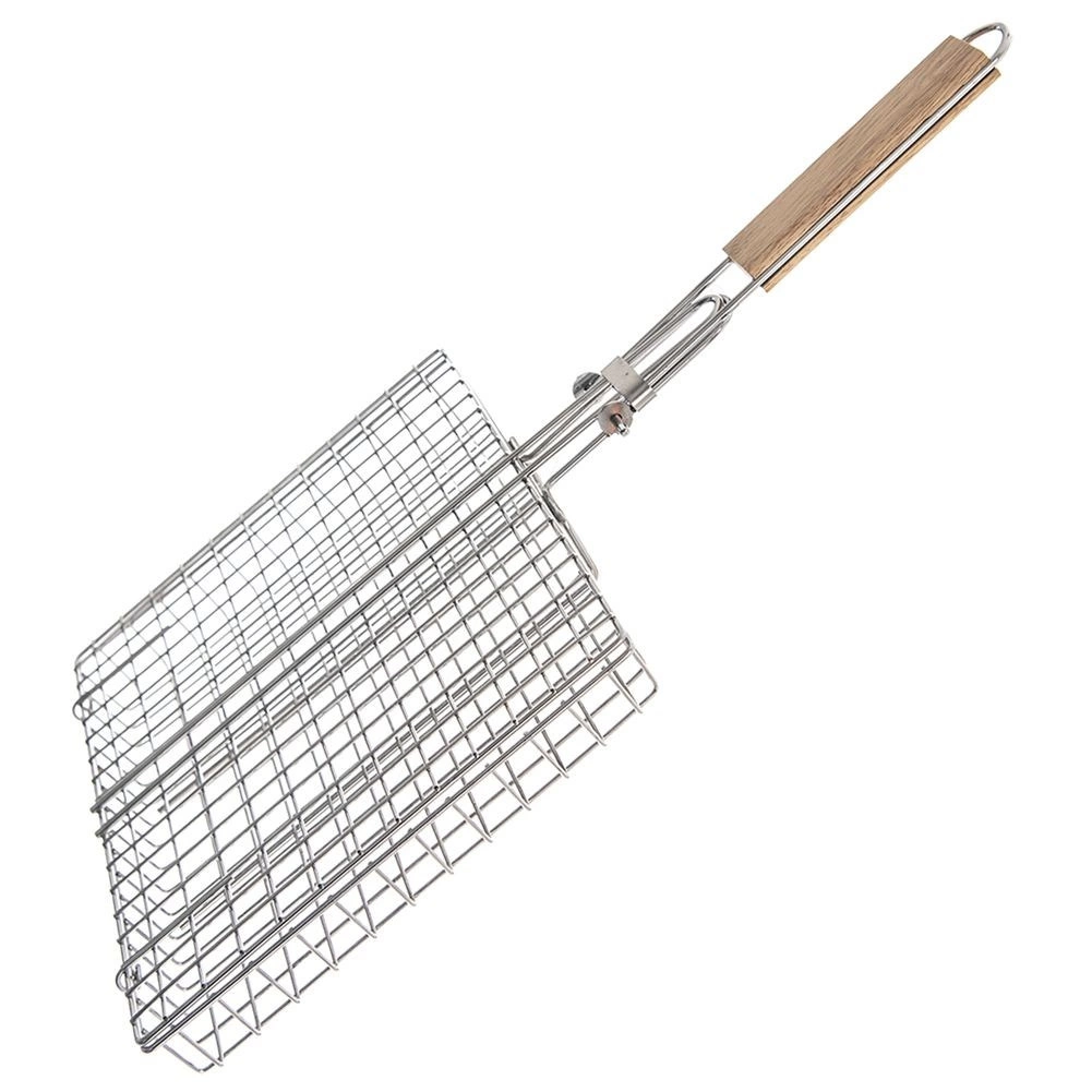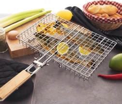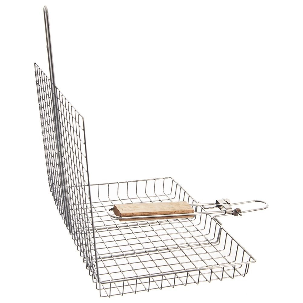 Praktikus, zárható grillkosár fa nyéllel, amely megkönnyíti a zöldség, a hal és a hús elkészítését. A finom drótrács megakadályozza a darabok kiesését, a csúszózár szilárdan a helyén tartja az ételeket, a hosszú nyél pedig biztonságos forgatást tesz lehetővé az izzó rács fölött.