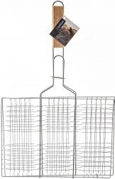 Praktikus, kétoldalas és zárható grillsütőrács krómozott fémből, hosszú fa nyéllel a biztonságos kezeléshez. Ideális burgerekhez, valamint húsokhoz, halakhoz és zöldségekhez. Kialakításának köszönhetően egyenletes hőkeringést biztosít, és lehetővé teszi a könnyű megfordítást az ételek szétesése nélkül.
