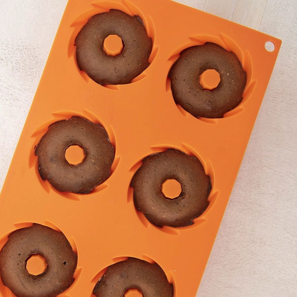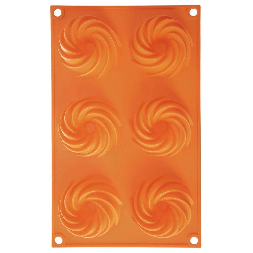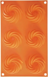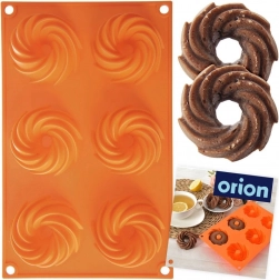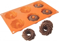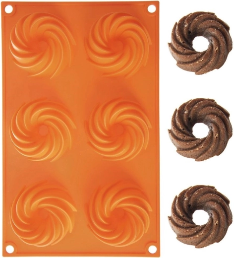 Ez a narancssárga szilikon forma megkönnyíti a tökéletesen formázott mini kuglófok elkészítését odaégés és bonyolult kikenés nélkül. A tapadásmentes felületnek köszönhetően a tészta könnyen kivehető, a forma pedig nem veszi át a szagokat és az ízeket. A 28 × 17 × 3 cm-es méret 6 darab, 7 cm átmérőjű desszertet fogad be.