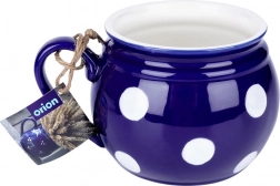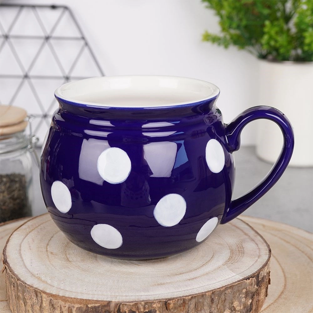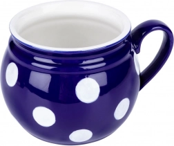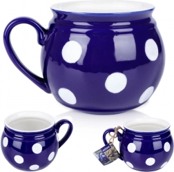 Nagy, füllel ellátott 850 ml űrtartalmú kerámia bögre elegáns sötétkék színben fehér pöttyökkel. Kényelmes füle van, „hordó” formájú, és ideális teához, kávéhoz, kakaóhoz és forralt borhoz. Mosható mosogatógépben és használható mikrohullámú sütőben, ezért tökéletes a mindennapi használatra.