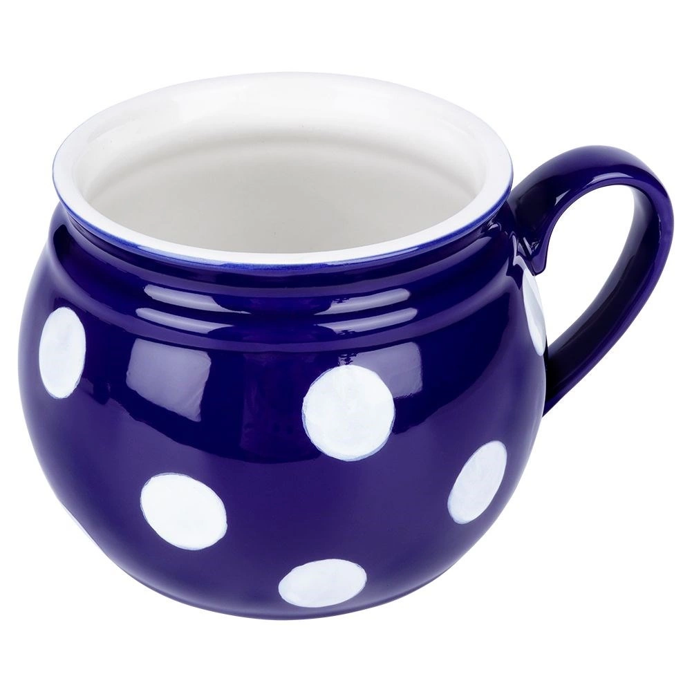 Élvezze kedvenc italait nagy stílusban. Ez a 850 ml-es kerámia bögre remek választás mindenkinek, aki szereti a nagyobb adag teát, kávét vagy gyógynövényes főzeteket. A klasszikus hordó formájú kialakítás, a sötétkék máz és a nagy fehér pöttyök feldobják a megterített asztalt, és remekül passzolnak más edényekhez is.