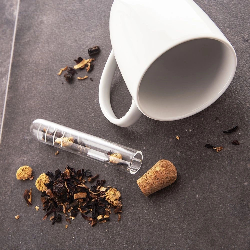 Praktikus üveg teaszűrő tea és gyógynövények számára, fiola formában, 13 cm hosszban, amely tiszta, levélmentes főzetet biztosít a csészében. A parafadugónak köszönhetően könnyen kivehető és kényelmesen kezelhető. Minőségi, átlátszó üvegből készült, amely ellenálló, higiénikus, és remekül kiemeli az ital színét. Ideális a szálas teák és a gyógynövény-keverékek kedvelőinek.