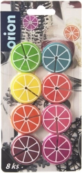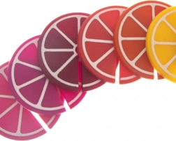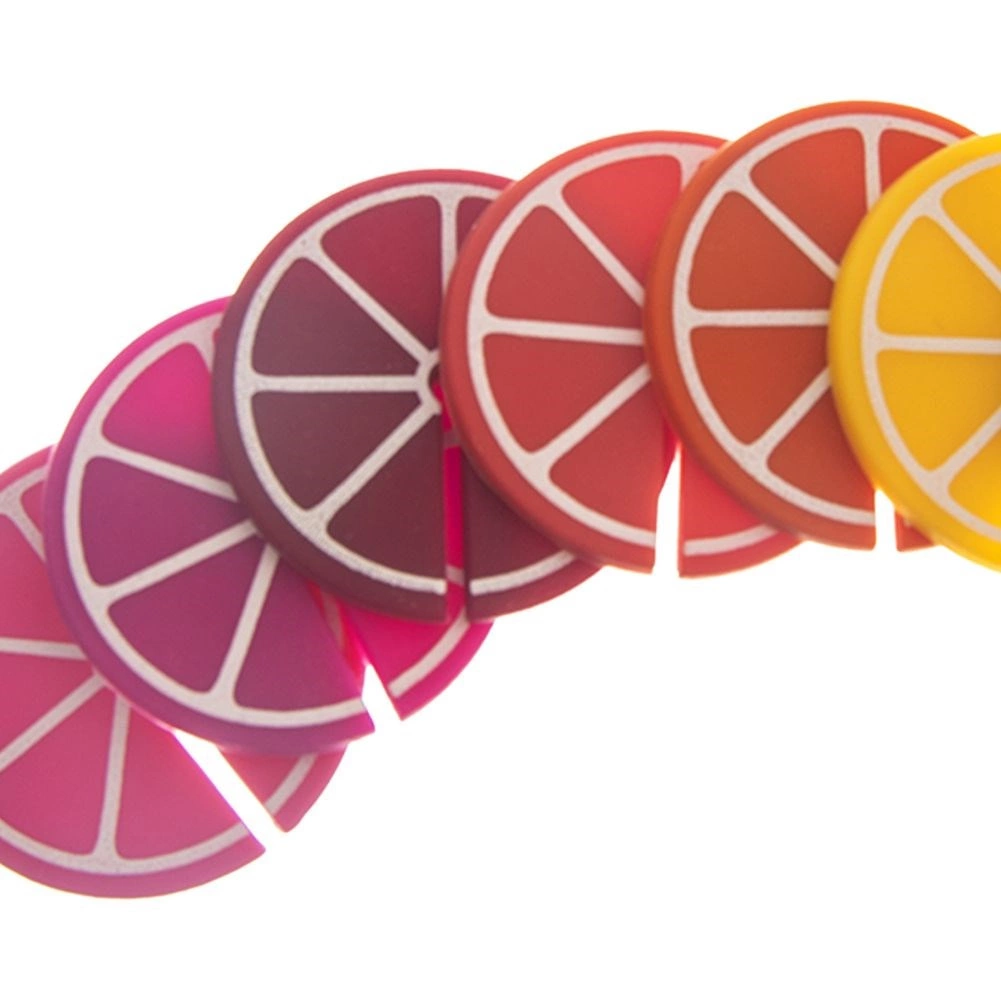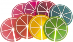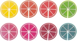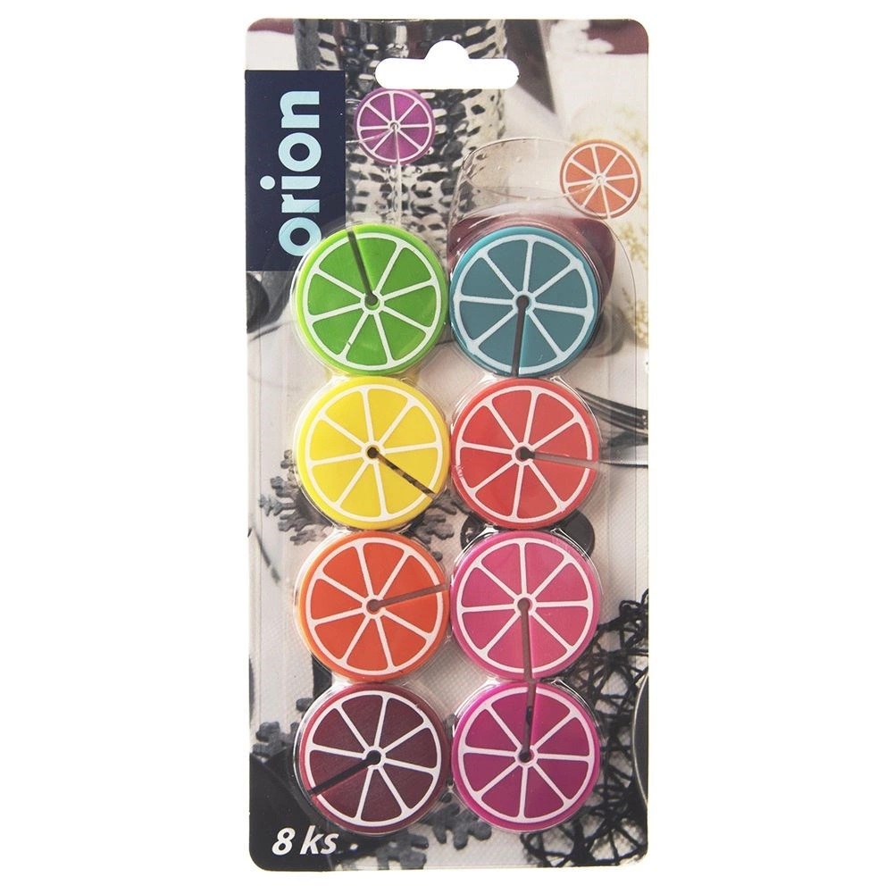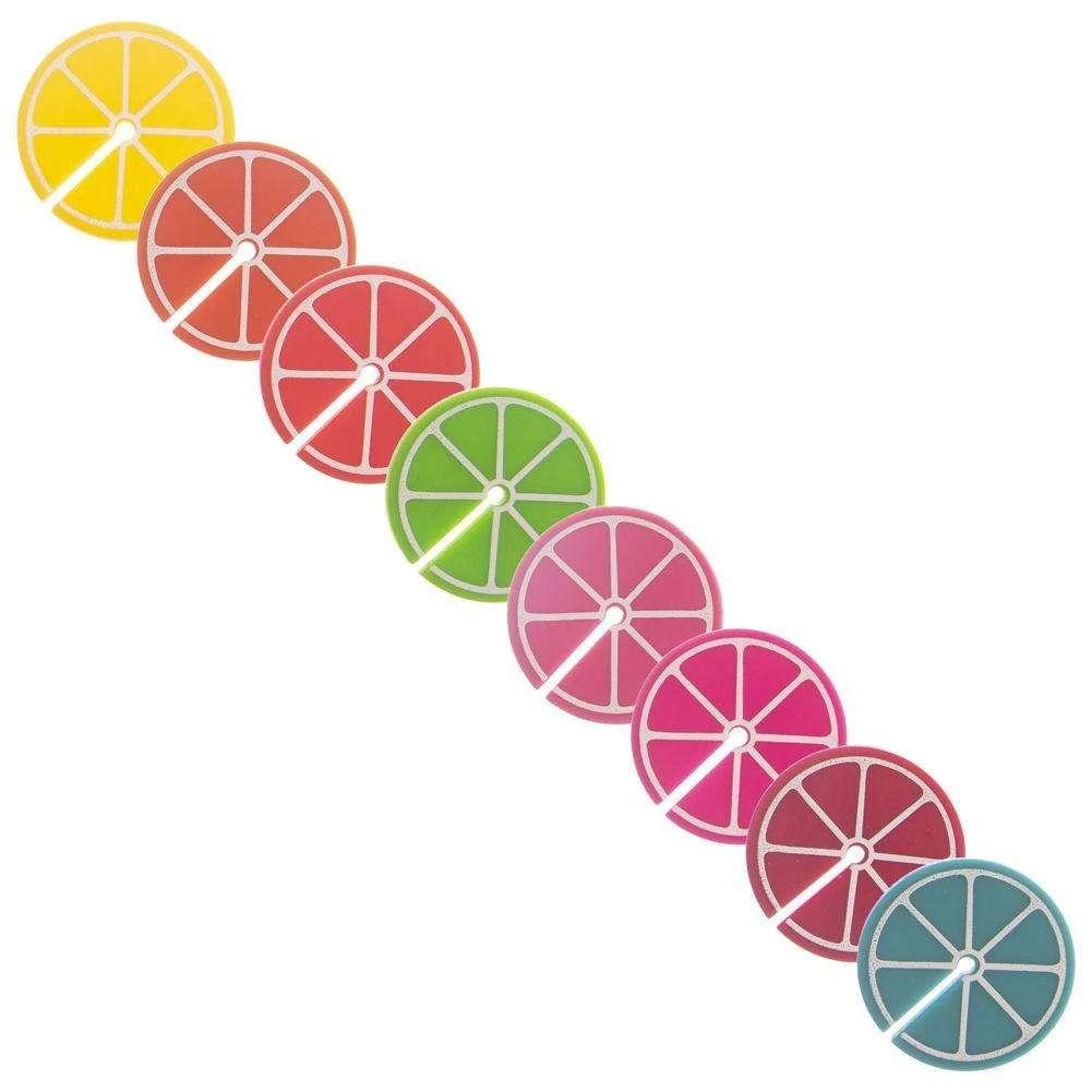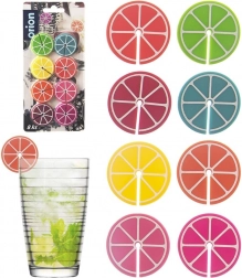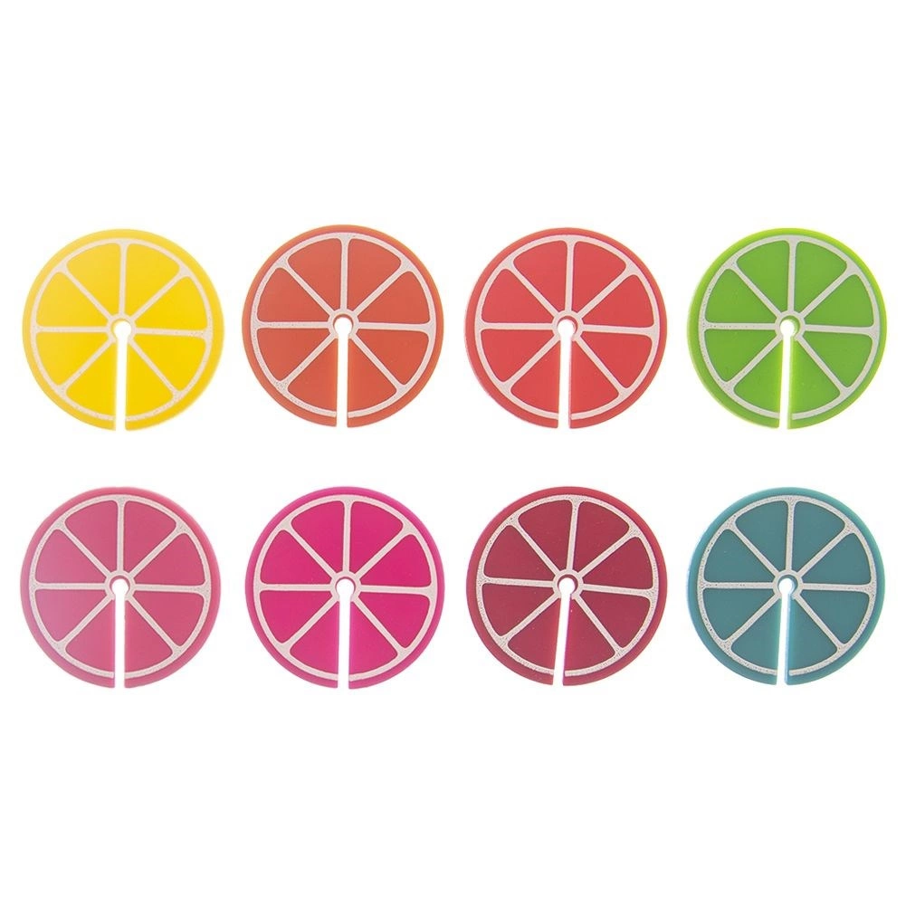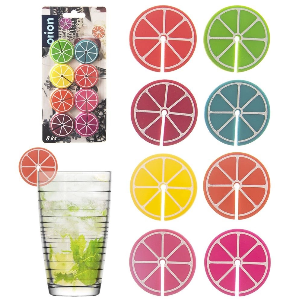 Praktikus, 8 darabos színes pohárjelölő-készlet citruskarikák formájában, 3,7 cm átmérővel. A különböző színeknek köszönhetően minden vendég könnyen felismeri a saját italát. Szilikonból készült, többször használható, ideális bulikra és családi összejövetelekre.