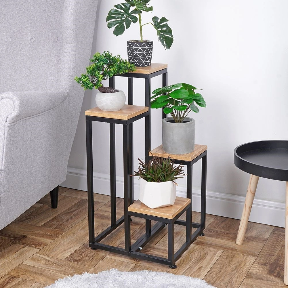 Elegáns fém virágtartó állvány négy polccal, 69 cm magasságban, ideális növények és dekorációk kihelyezéséhez. A fém és a fa hatású MDF kombinációja tartósságot, stabilitást és stílusos ipari megjelenést garantál. Kompakt méreteinek köszönhetően jól illik a nappaliba, irodába, valamint a erkélyre vagy teraszra is. Maximális teherbírása akár 50 kg.