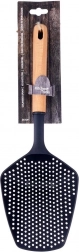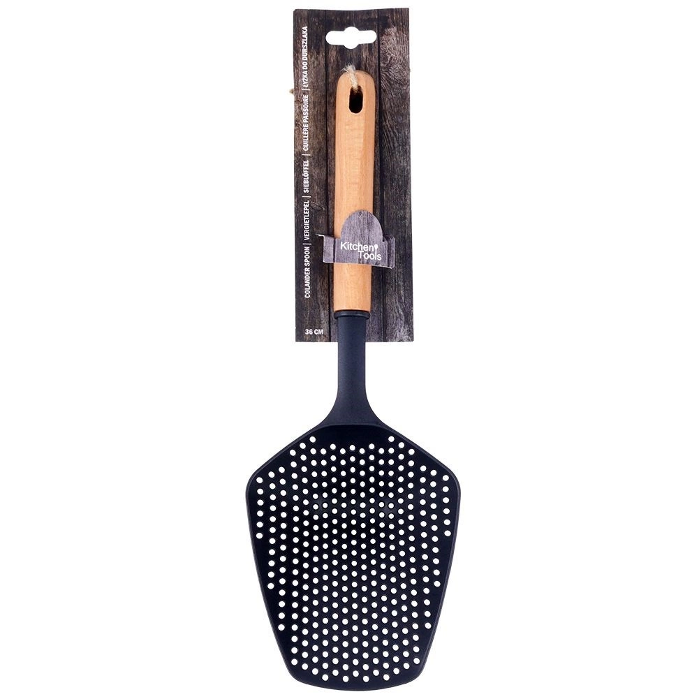 Praktikus konyhai szűrőkanál lyukacsos fejjel, 36 cm hosszban az egyszerű leszűréshez és tálaláshoz. A tartós nejlon és a természetes fa nyél kombinációja kíméletes a tapadásmentes felületekhez. Az univerzális felhasználás, az ergonomikus nyél, a magas hőállóság és a felakaszthatóság megbízható segítőtárssá teszi minden konyhában.