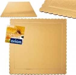 Elegáns, négyzet alakú torta-alátét 34 × 34 cm méretben, stílusos tálaláshoz és biztonságos szállításhoz. Kétoldalas, arany színű, erős kartonból és nedvességálló fóliával ellátva – hűtőszekrénybe is ideális.