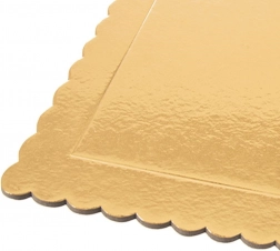 Prémium arany torta- vagy süteményalátét, kiváló szállításhoz, díszítéshez és desszertek kiállításához. Mindkét oldalán fóliázott, így nedvességálló és nem ázik fel, ezért a kész tortát biztonságosan beteheti a hűtőbe. A hullámos díszszél professzionális megjelenést kölcsönöz alkotásainak.