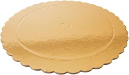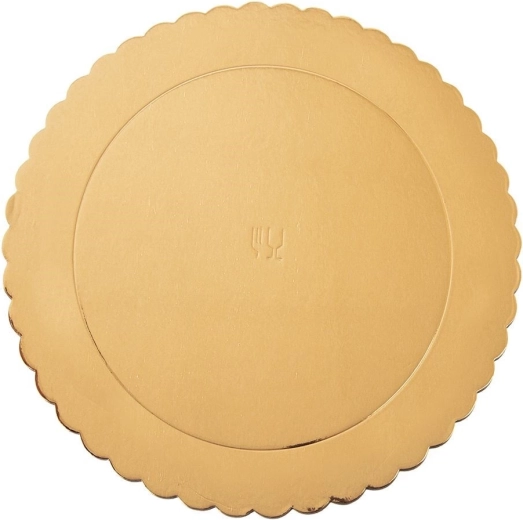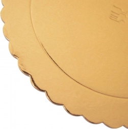 Elegáns arany tortaalátét 26 cm átmérővel, ideális desszertek prezentálásához, szállításához és biztonságos transporteálásához. Kétoldalas, masszív kartonból készült, mindkét oldalon védőfóliával, és dekoratív hullámos peremmel rendelkezik. A vízálló felületnek köszönhetően hűtőben is tárolható, és gond nélkül elbírja a nehezebb tortákat is.