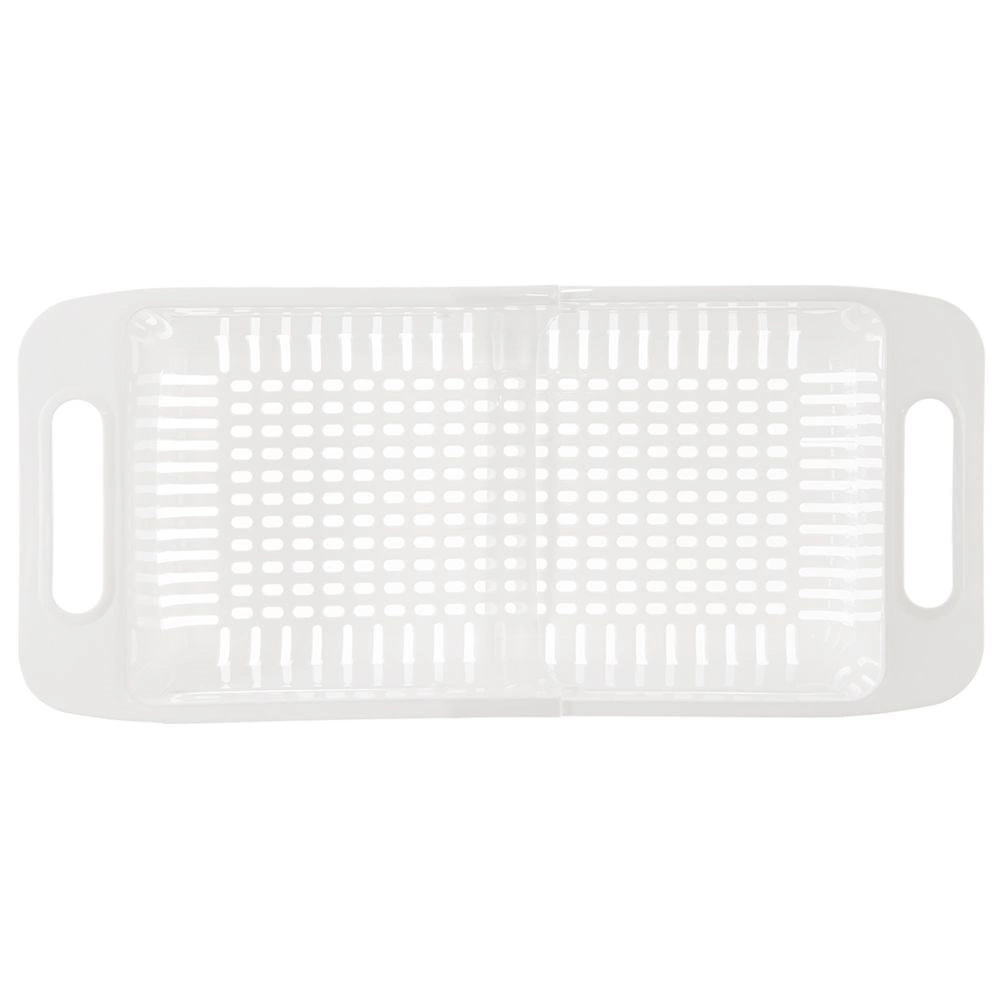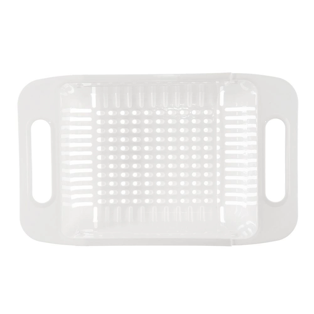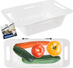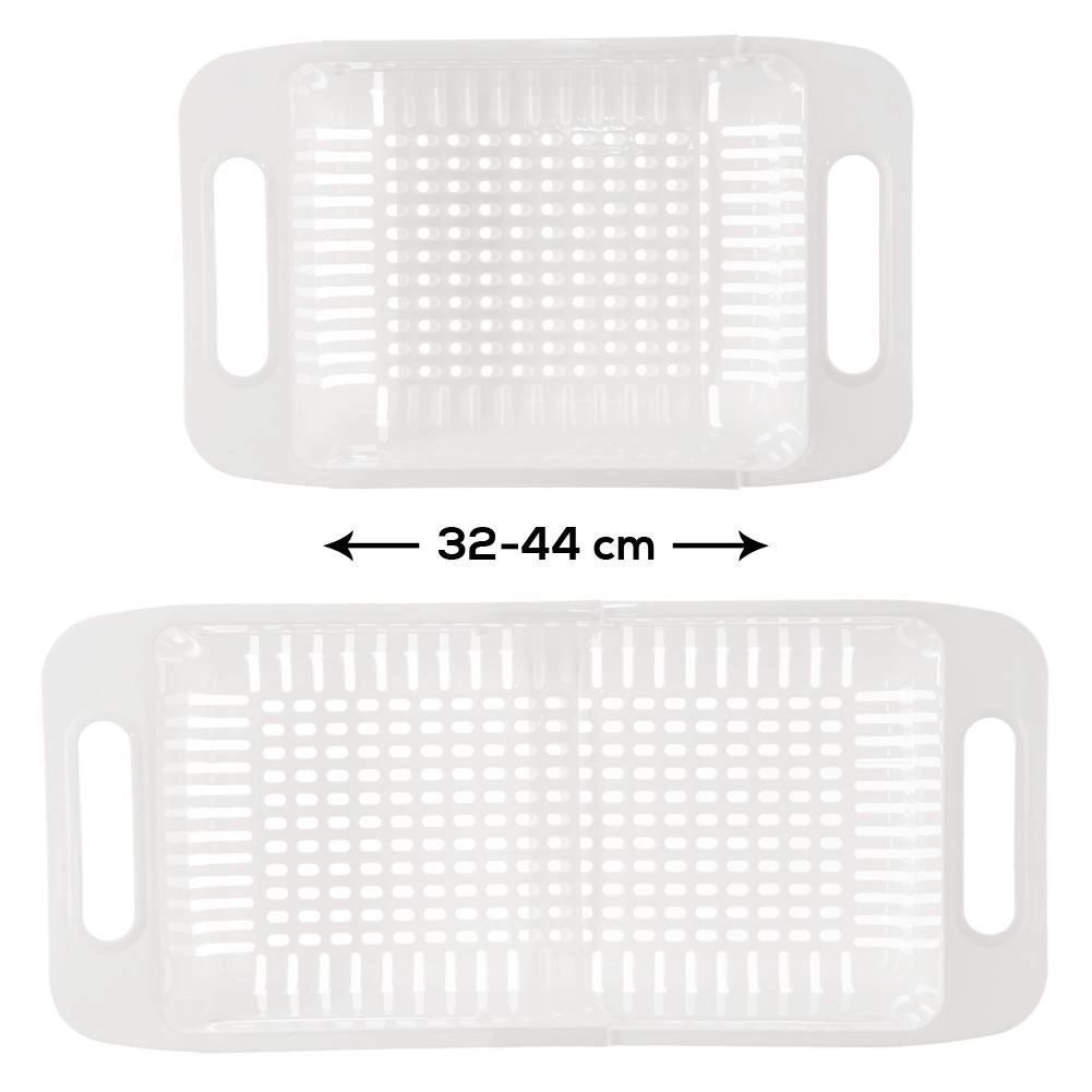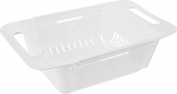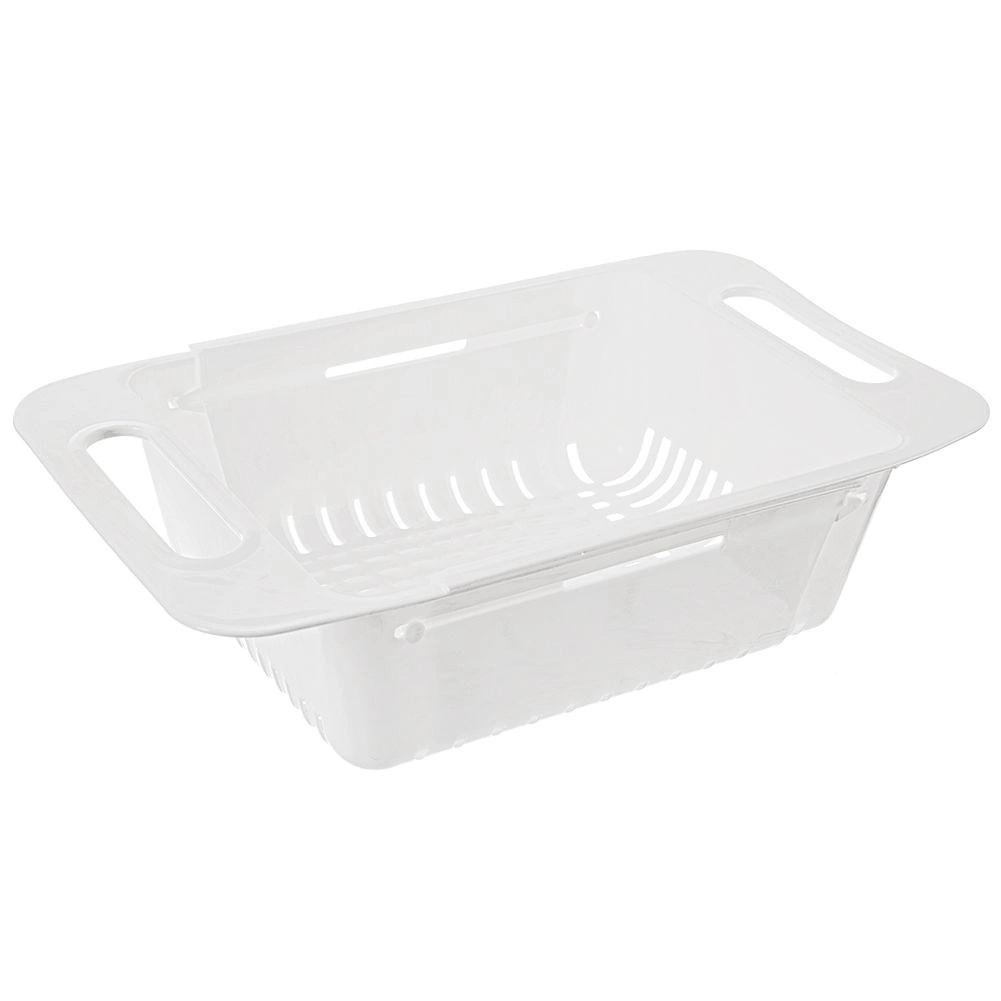 Univerzális mosogató szűrő állítható hosszal a gyümölcs és zöldség kényelmes mosásához, valamint a tészta leszűréséhez. Tartós műanyagból készült, fehér színben, könnyen tisztítható és mosogatógépben mosható. A teleszkópos fogantyúknak köszönhetően különböző méretű mosogatókhoz illeszkedik.
