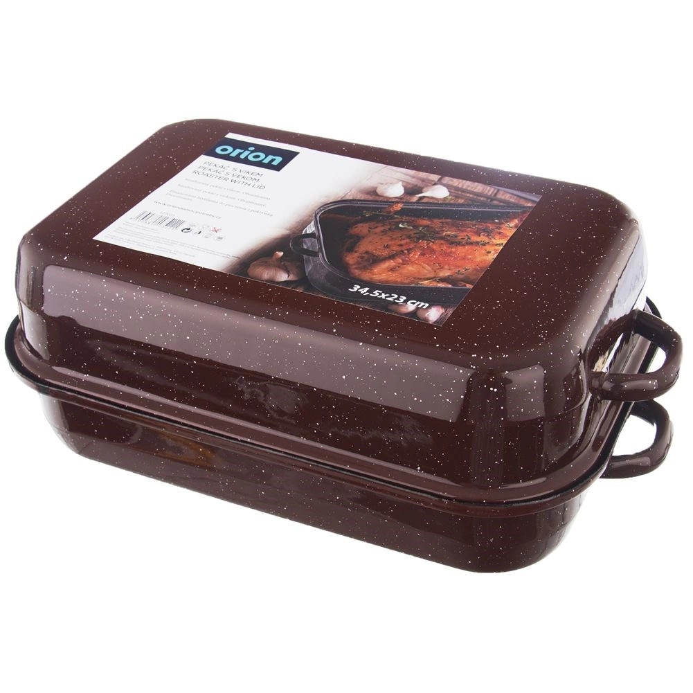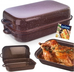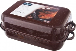 Téglalap alakú tepsi minőségi, zománcozott felületű acélból, barna színben, kiváló hővezetési tulajdonságokkal és hosszú élettartammal. A zománc egészségre ártalmatlan, allergiások számára is biztonságos. A fogantyús fedő önállóan is használható – így két praktikus edényt nyer sütéshez és tálaláshoz.