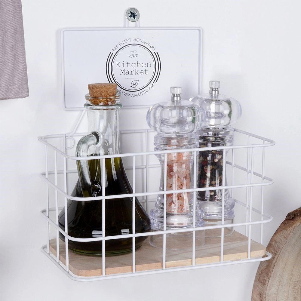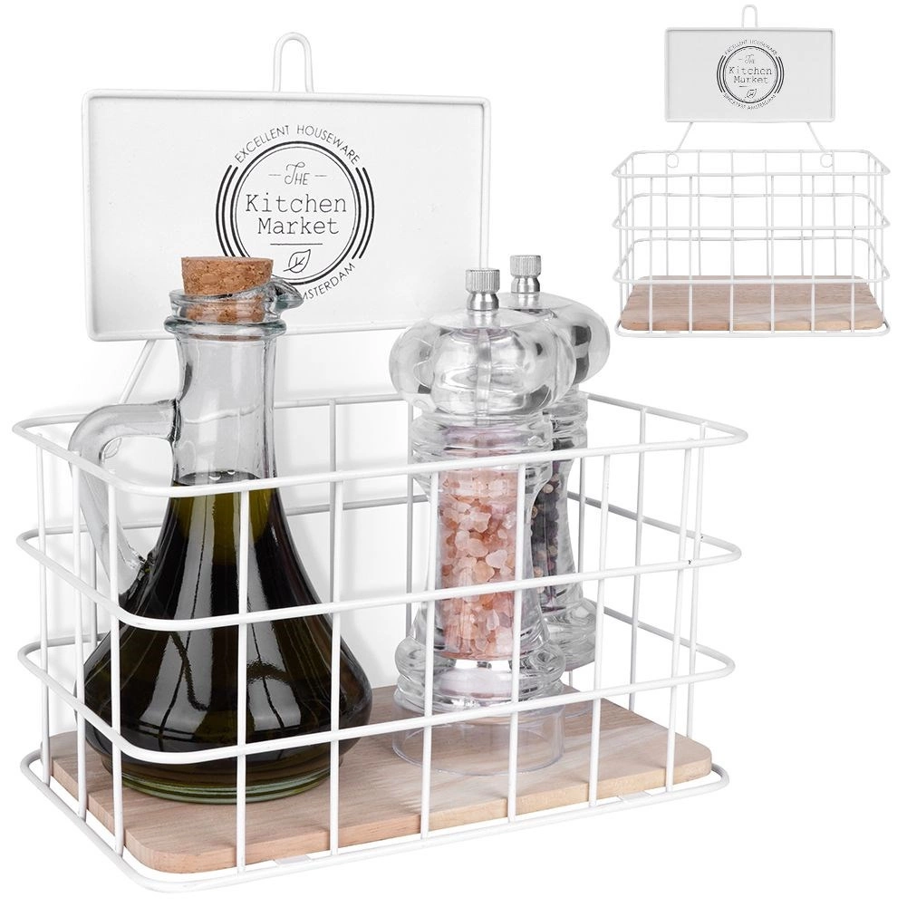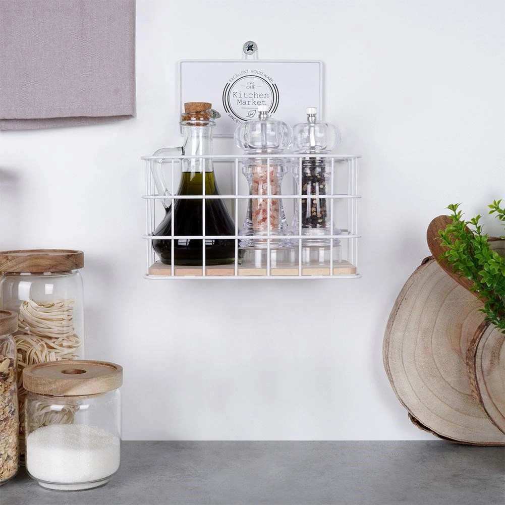 Ez az időtálló konyhai polc a fehér fém és a tölgyfa kombinációjával remekül illik modern és klasszikus enteriőrökbe egyaránt. A nyitott, dróthálós kialakítás áttekinthetőséget és gyors hozzáférést biztosít a tárolt tárgyakhoz, a dekoratív „The Kitchen Market” felirat pedig különleges hangulatot ad.