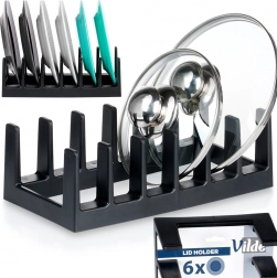 Praktikus fedő- és tányértartó állvány 28 × 15 × 9 cm méretben, amely akár 6 darabot is befogad. A strapabíró műanyag fekete kivitelének köszönhetően könnyű, egyszerűen tisztítható és hosszú élettartamú. Elhelyezhet benne fedőket, lapos és egyes mélyebb tányérokat vagy vágódeszkákat, így rendet tarthat a konyhaszekrényben vagy a fiókban.