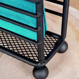 Stílusos fém szalvétatartó matt fekete kivitelben, a mindennapi kényelemhez és az elegáns terítékhez tervezve. A kompakt 11,5 × 4,5 × 10 cm-es méret helytakarékos, míg a tartós szerkezet függőlegesen és rendezetten tartja a szalvétákat.