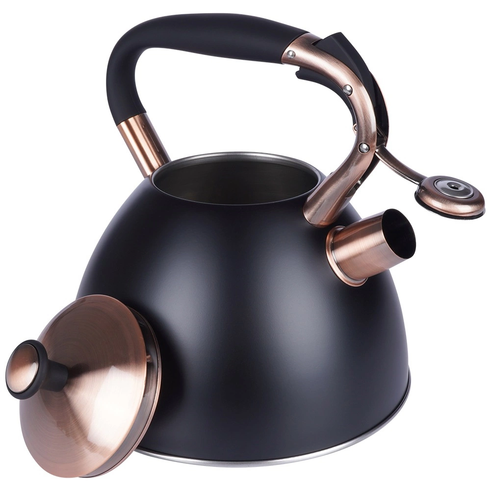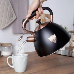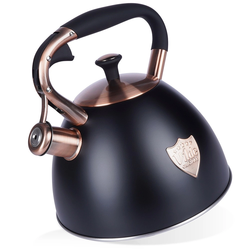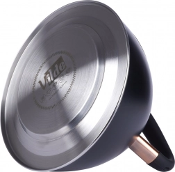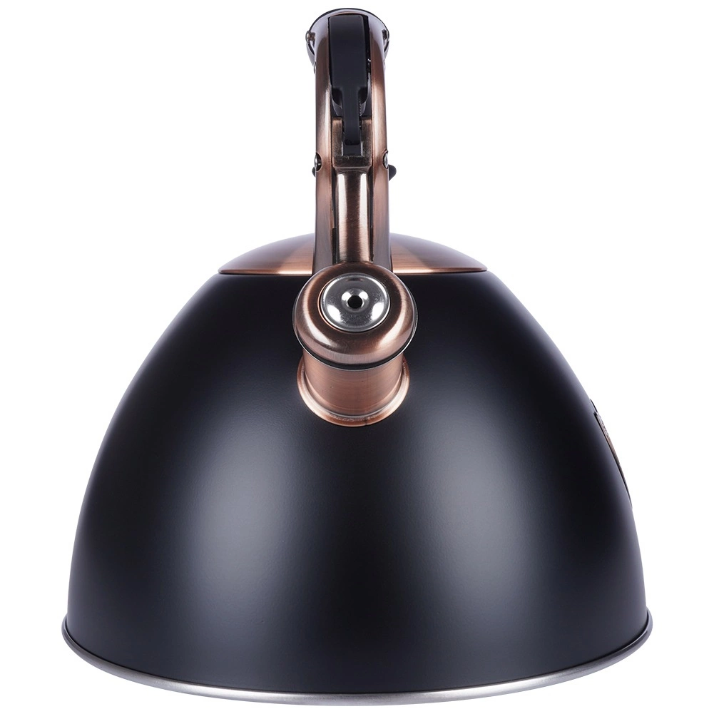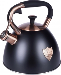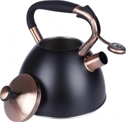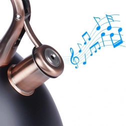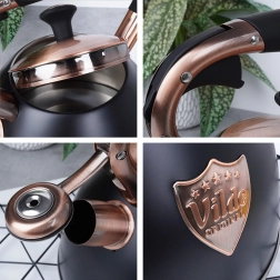 Stílusos acél sípoló kanna 3 l űrtartalommal, matt fekete színben rézszínű részletekkel, gyors vízmelegítéssel és kényelmes kiöntéssel. Minőségi rozsdamentes acélból, ergonomikus Soft Touch markolattal, automatikus sípoló fedéllel és többrétegű akutermikus aljjal a gyors felmelegítéshez minden tűzhelytípuson, beleértve az indukciót is.