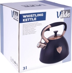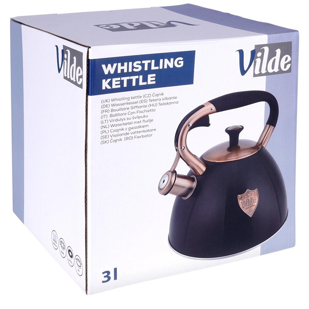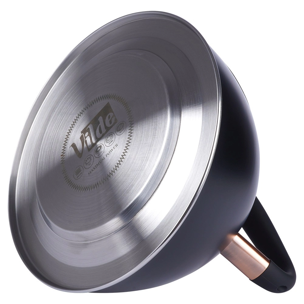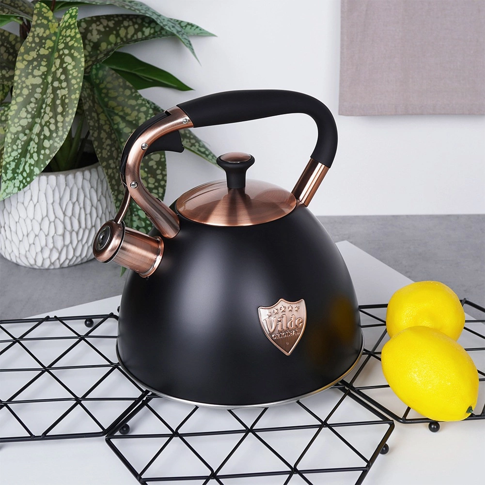 Stílusos acél sípoló kanna 3 l űrtartalommal, matt fekete színben rézszínű részletekkel, gyors vízmelegítéssel és kényelmes kiöntéssel. Minőségi rozsdamentes acélból, ergonomikus Soft Touch markolattal, automatikus sípoló fedéllel és többrétegű akutermikus aljjal a gyors felmelegítéshez minden tűzhelytípuson, beleértve az indukciót is.