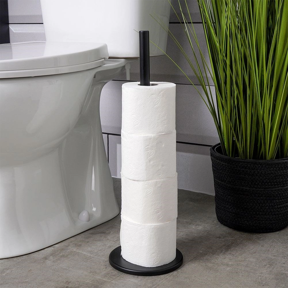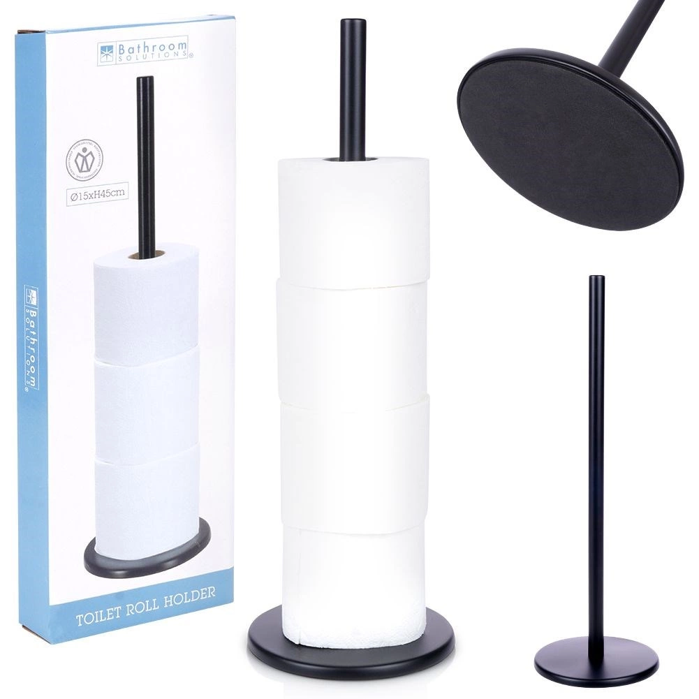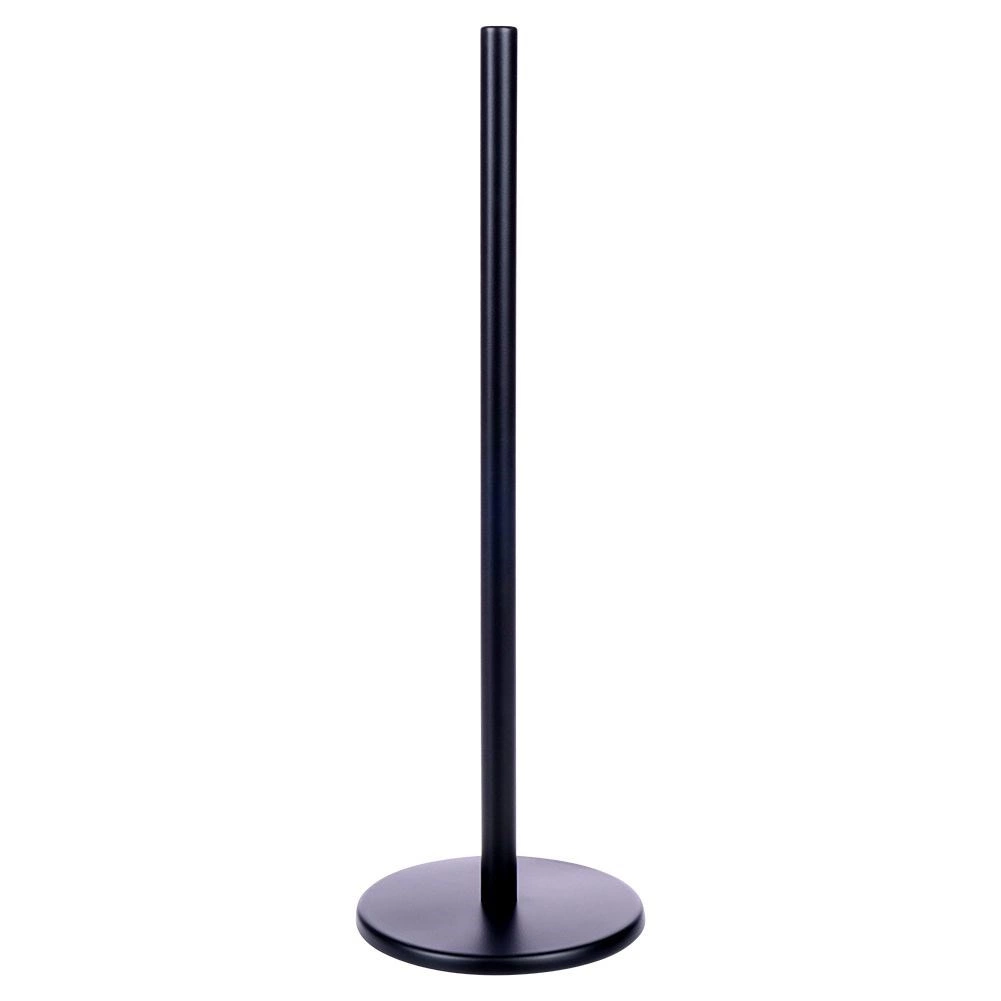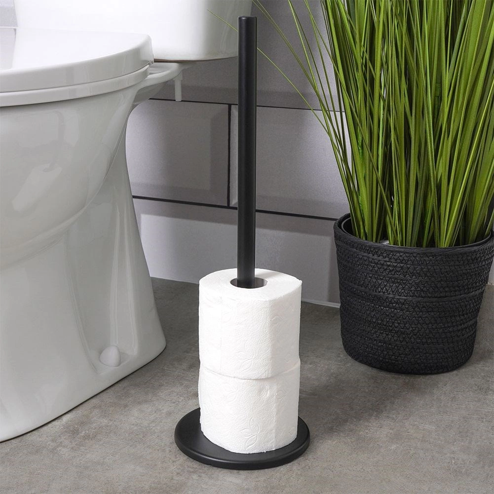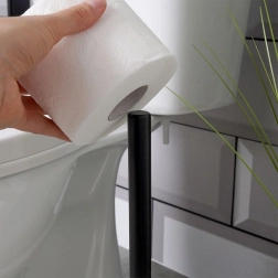 Szabadon álló WC‑papírtartó 47 cm magassággal és 15 cm átmérőjű talppal – praktikus és elegáns megoldás minden mellékhelyiségbe. Minimalista, matt fekete dizájnja a legtöbb fürdőszobastílussal jól harmonizál, és a tartalék gurigákat mindig kézközelben tartja.