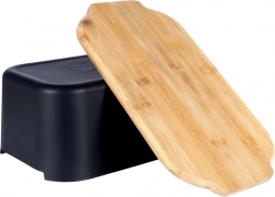 A modern kenyértartó matt fekete színű, strapabíró műanyag testet kombinál természetes bambusz fedéllel. A fedél vágódeszkaként használható, így a pékáru tálalásához minden kéznél van. A 33 × 18,5 × 12 cm-es kompakt méreteknek köszönhetően könnyen elfér a munkalapon, miközben különféle pékárukat is befogad.