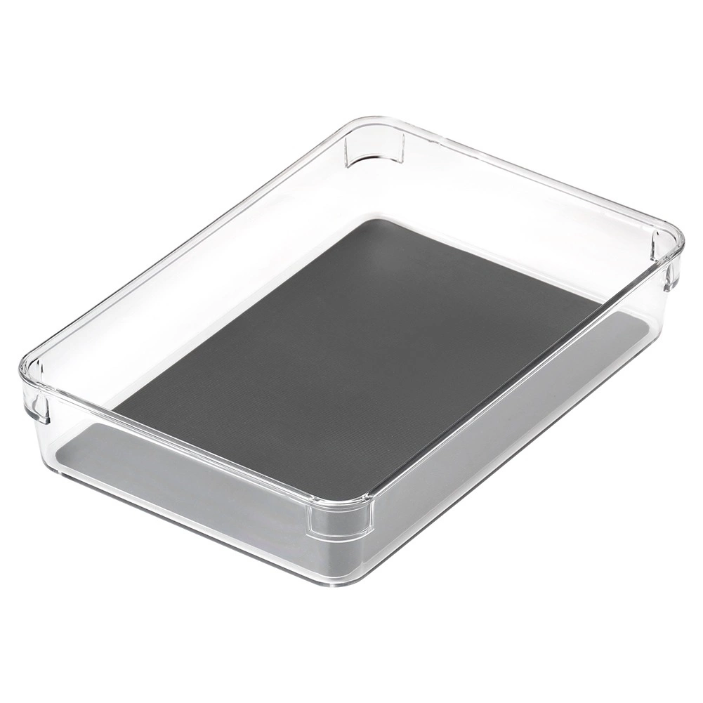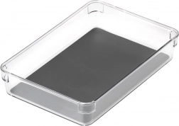 GREY tároló tálca tartós, átlátszó rendező kivehető TPE betéttel, amely megakadályozza a tárgyak csúszását és megkönnyíti a tisztítást. A csúszásgátló lábak stabilitást biztosítanak fiókban és polcon is, így nyitáskor sem mozdul el.