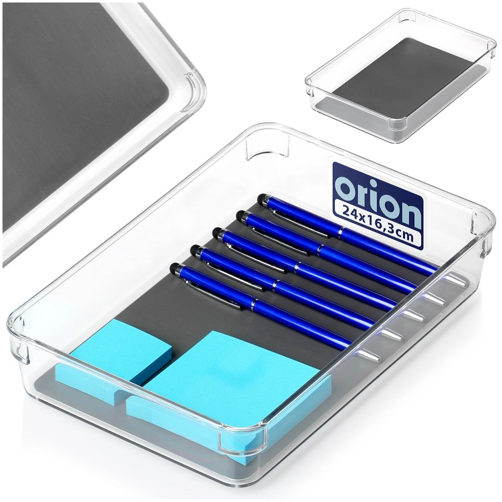 Praktikus, univerzális fiók- vagy szekrényrendező a konyhai, irodai és kozmetikai eszközök áttekinthető tárolásához. Átlátszó falai megkönnyítik a tájékozódást, belül kivehető szürke gumibetét található, alul pedig csúszásgátló lábak tartják stabilan a helyén. A 24 × 16 × 4,5 cm-es méretnek köszönhetően a legtöbb fiókba jól illeszkedik, és segít rendben, elcsúszás nélkül tartani az elhelyezett tárgyakat.