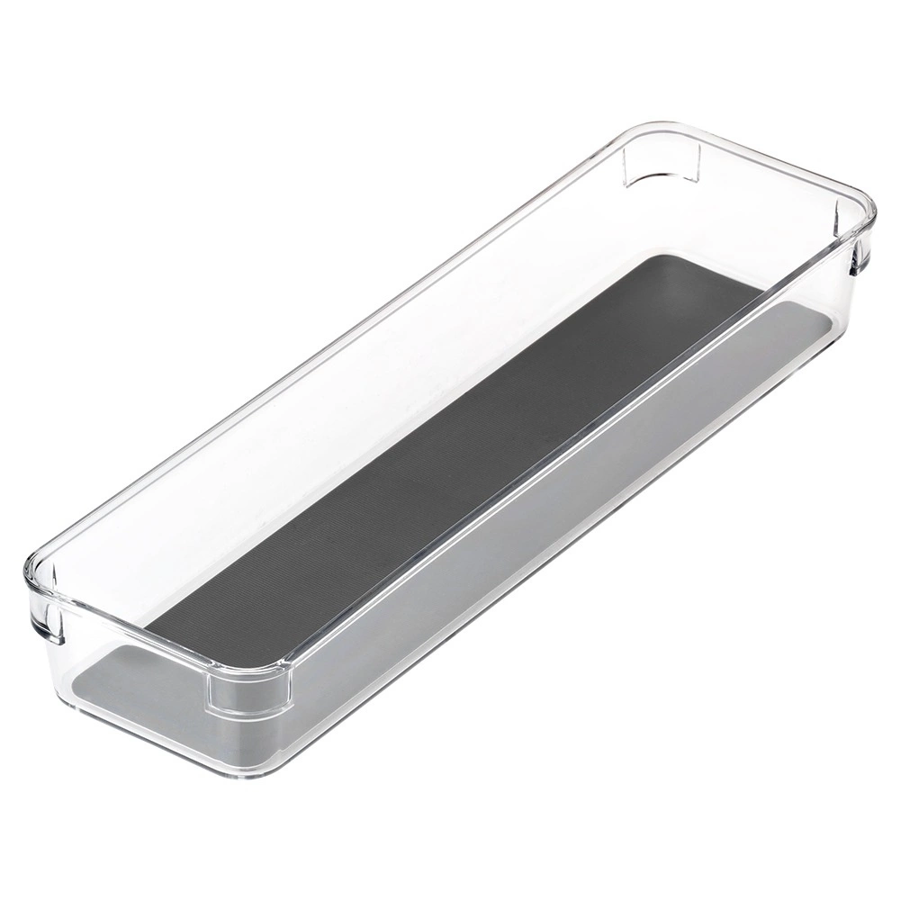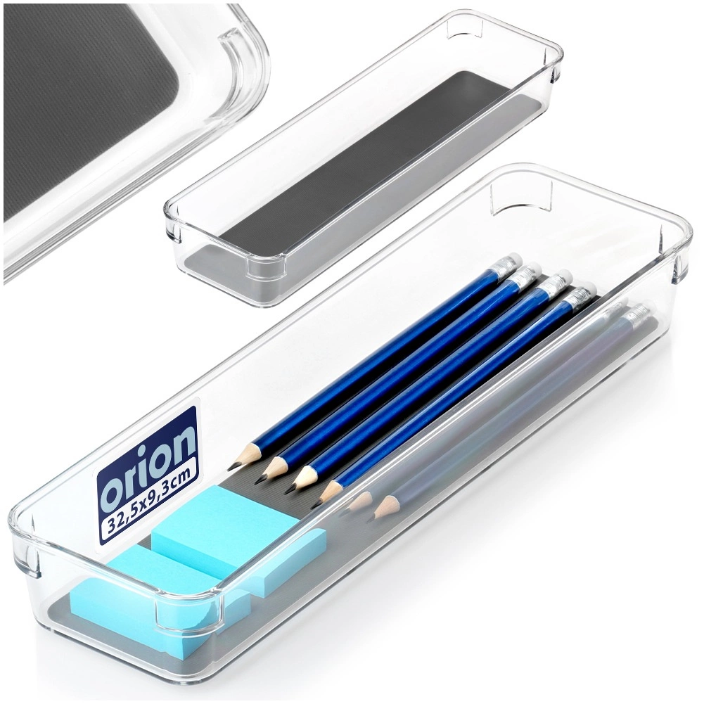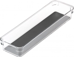 Praktikus, univerzális fiókszervező átlátszó műanyagból, szürke gumibetétettel, amely rendet tart a konyhában, irodában és a fürdőszobában is. A 32,5 × 9 × 4,5 cm-es méretnek köszönhetően a legtöbb fiókba és szekrénybe illeszkedik. Strapabíró kivitel, csúszásgátló lábak és a könnyen tisztítható, kivehető betét gondoskodnak az elhelyezett tárgyak stabilitásáról és átláthatóságáról. Ideális evőeszközökhöz, írószerekhez, kozmetikumokhoz, valamint apró eszközökhöz a műhelyben vagy a hűtőben.