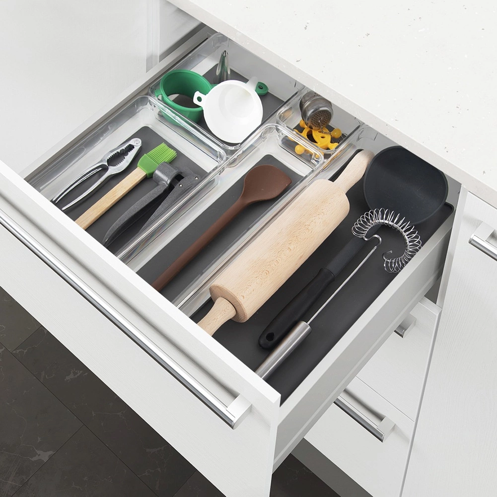 Rendezze gyorsan és hatékonyan a fiókokat és polcokat. Az átlátszó falak azonnali rálátást biztosítanak a tartalomra, míg a szürke TPR betét megakadályozza a tárgyak csúszkálását. A szervező strapabíró, stabil, és kompakt szélességének köszönhetően a keskeny helyekre is remekül illik.