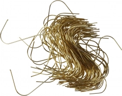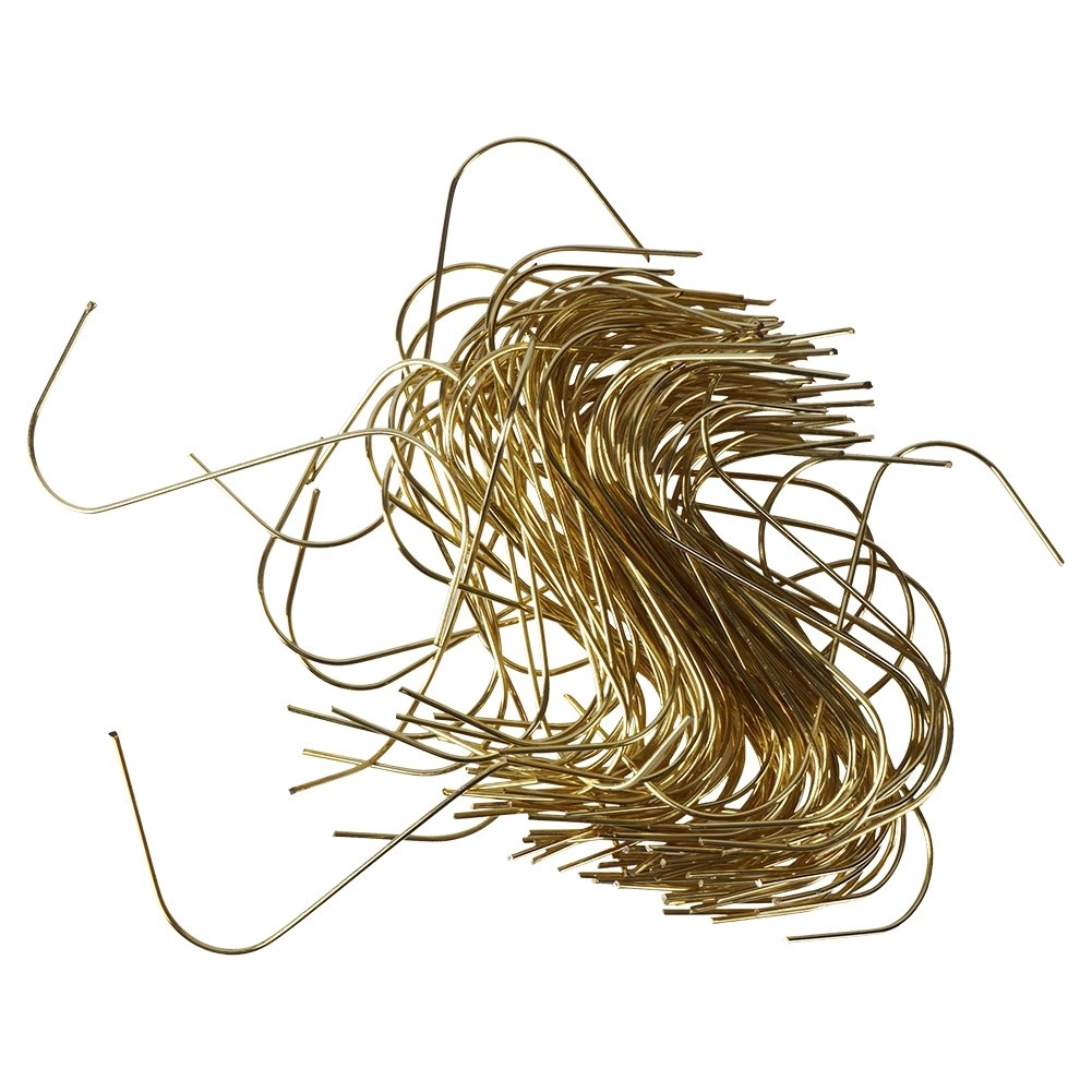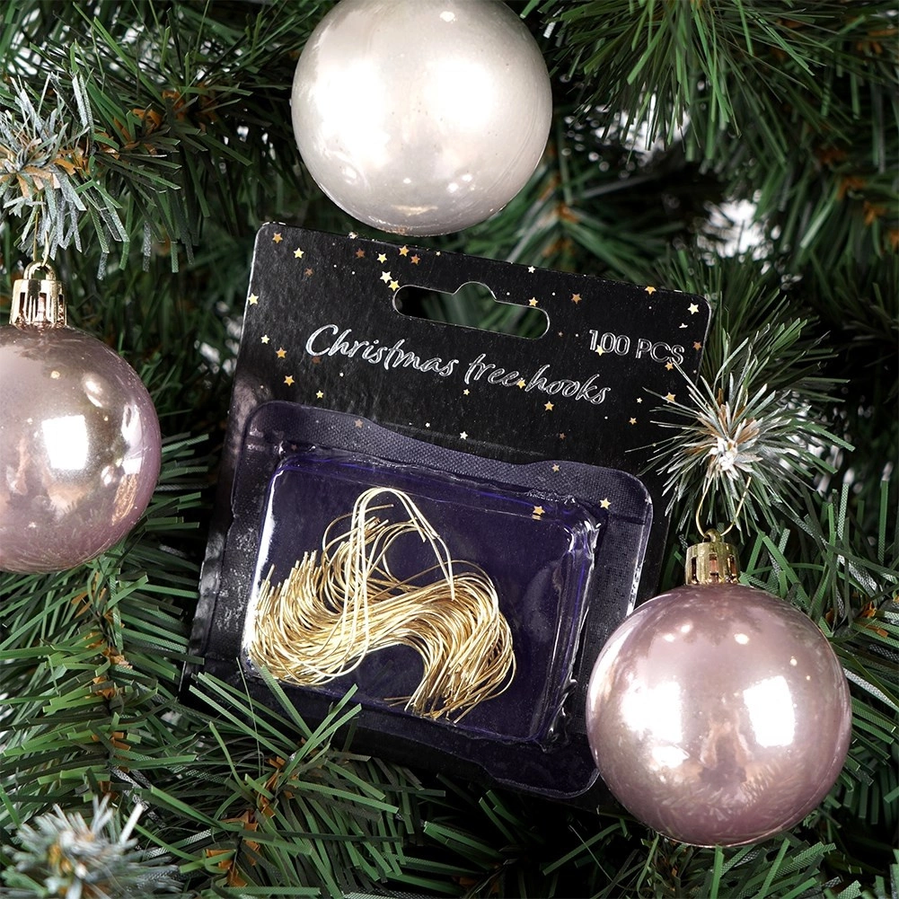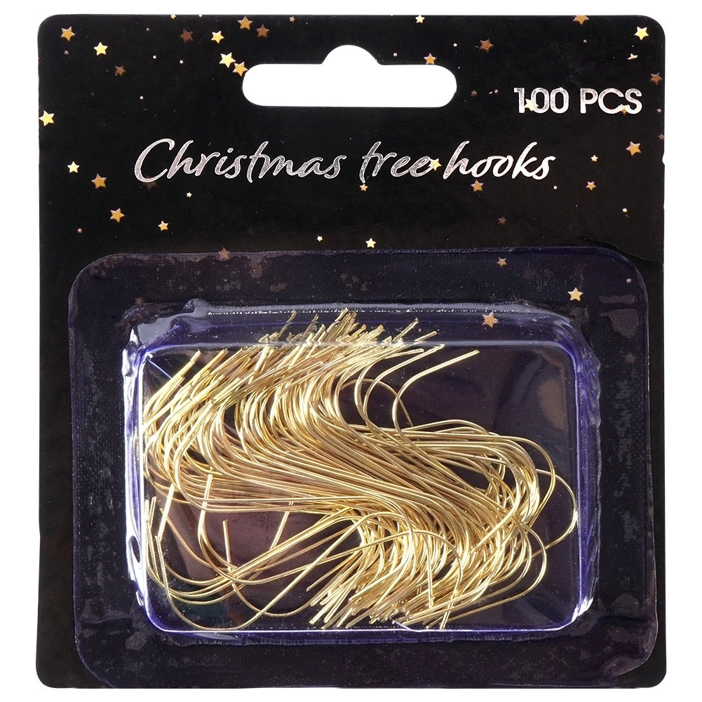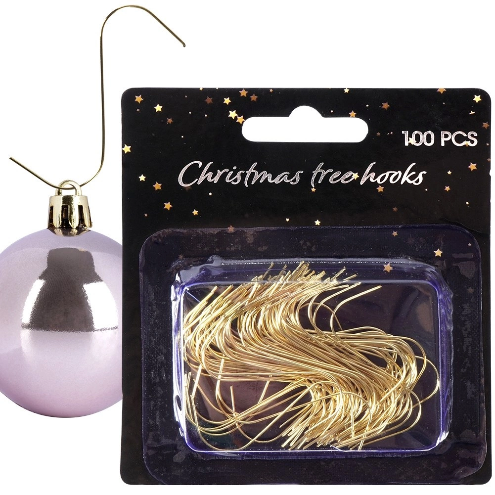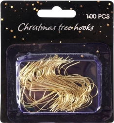 Praktikus készlet 100 fém akasztóból arany színben a karácsonyfadíszek egyszerű és biztonságos felakasztásához. A 4 cm-es hossznak köszönhetően különféle típusú és méretű dekorációkhoz illik, erős, többször használható, és ergonomikus formájú a gyors, erőfeszítés nélküli rögzítéshez – akár gyerekeknek is.