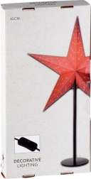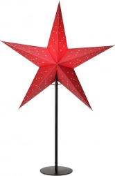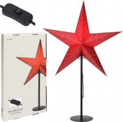 Stílusos asztali lámpa 3D karácsonyi csillag formában, amely ünnepi hangulatot és meghitt fényt kölcsönöz a belső térnek. A masszív csillag erős kartonból készült, piros színben, fekete fém állványon, 70 cm magas, a csillag átmérője 45 cm. Hálózati táplálással, 1,9 m-es kábellel és kapcsolóval rendelkezik. E14 foglalattal kompatibilis (az izzó nem tartozék).