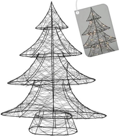 Design karácsonyfa minőségi fekete fémből, minimalista megjelenéssel és kellemes, meleg fényű világítással. A fekete, összefonódó drótok egyedi formát alkotnak, amely komódon, asztalon vagy polcon is remekül mutat. Ideális dekoráció az otthon ünnepi, meghitt hangulatának megteremtéséhez.