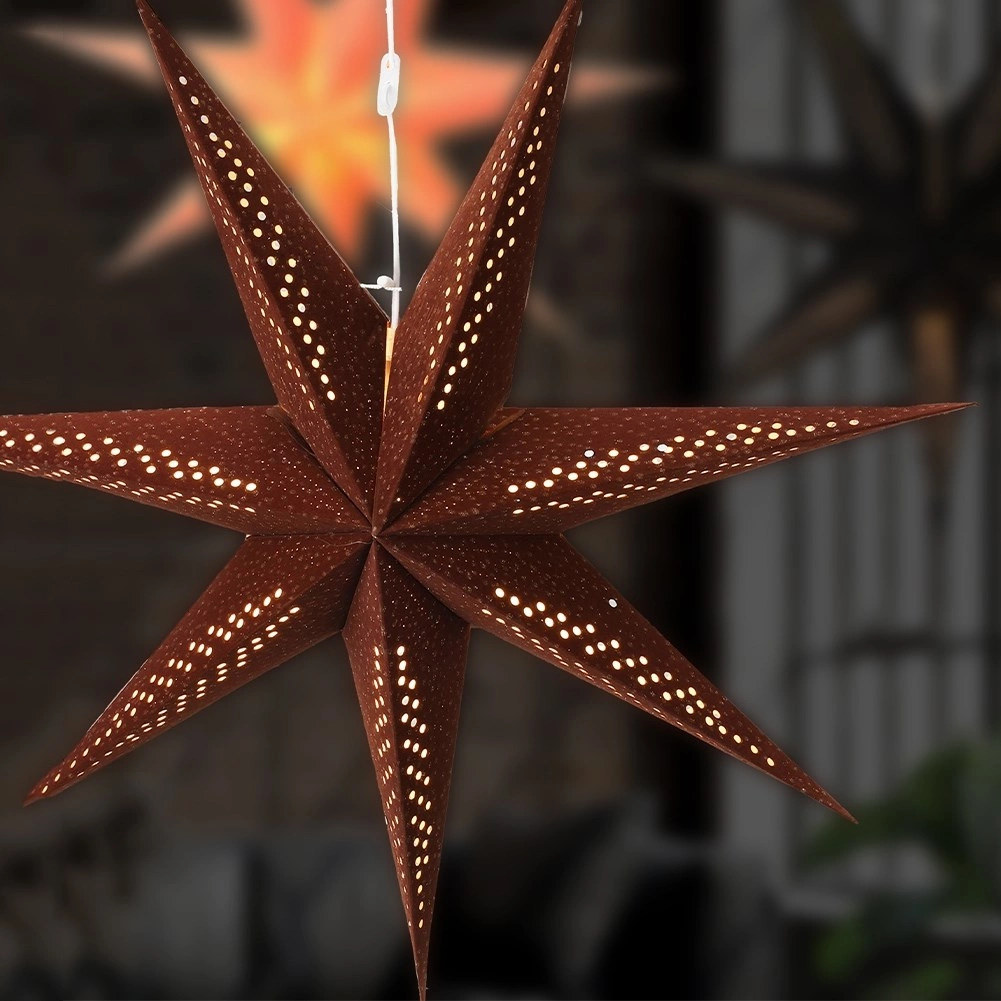 Ez a dekoratív, 3D kivitelű papírcsillag az ünnepek idején és egész évben otthona fókuszpontja lehet. A barna árnyalatú, puha bársonyos felület arany csillogó akcentusokkal luxushatást kelt, míg a perforált minta átengedi a fényt és elbűvölő fényjátékot teremt.