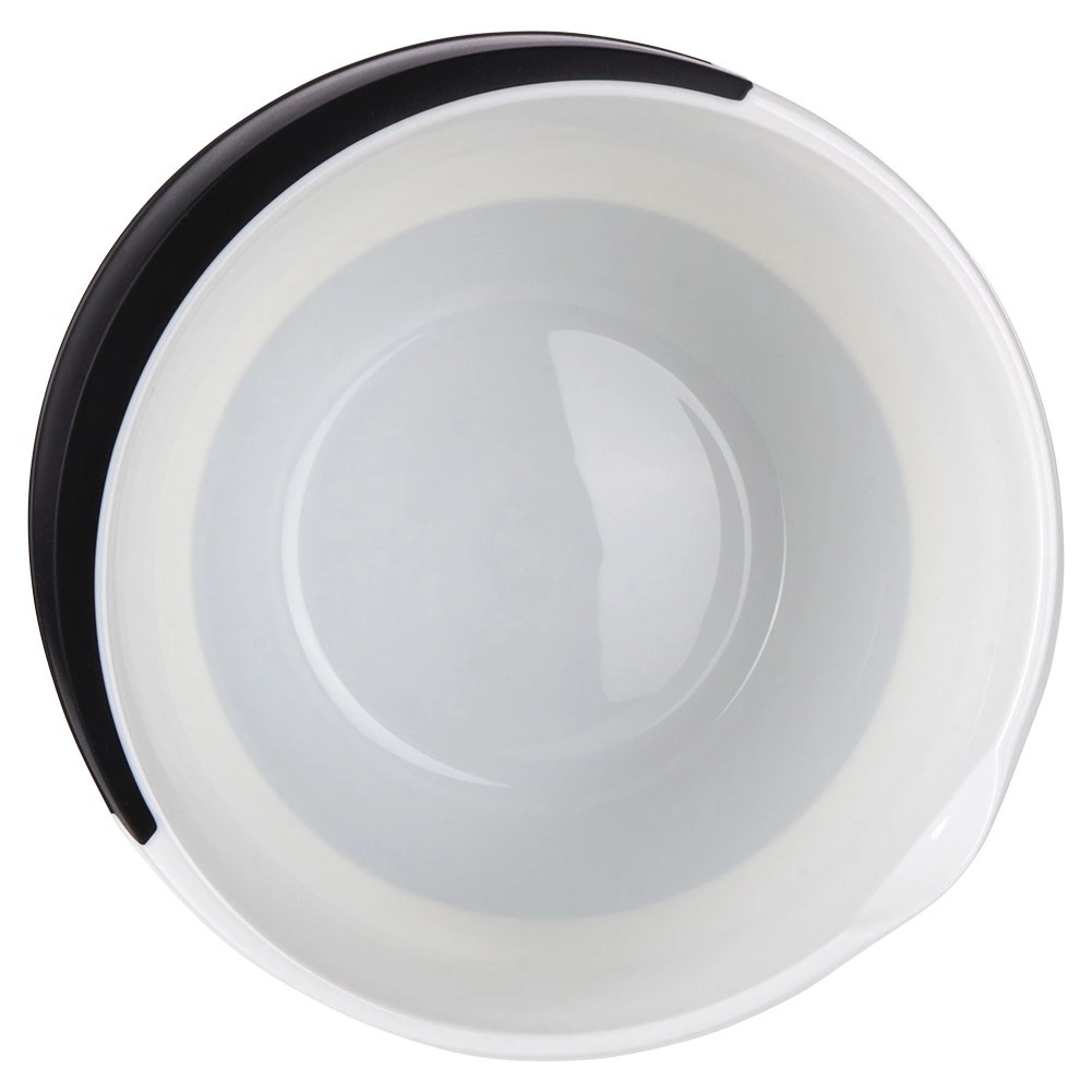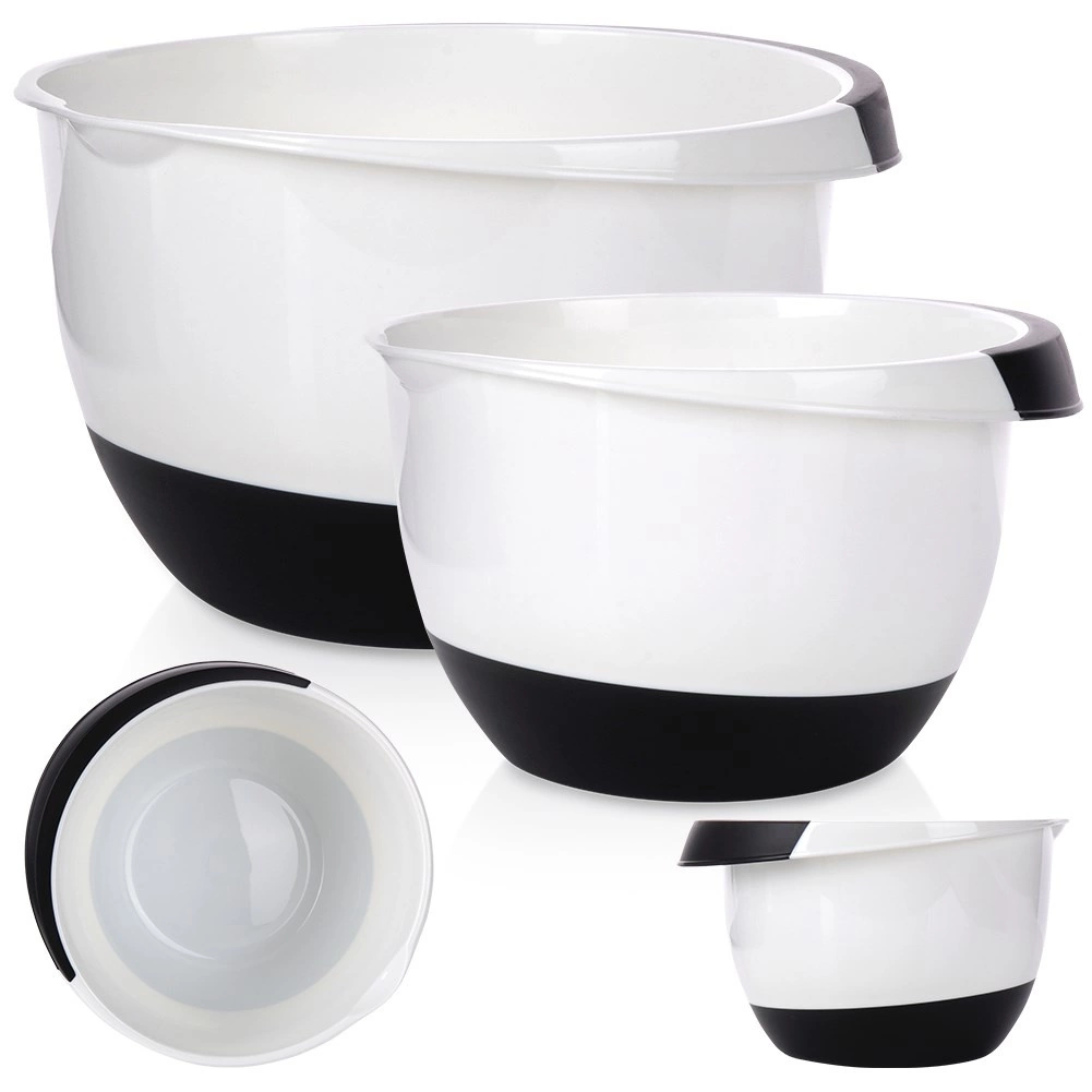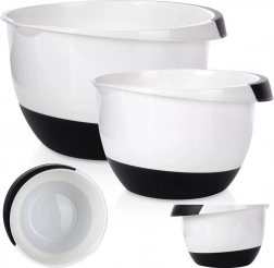 Sokoldalú, fehér konyhai tálkészlet fekete, csúszásgátló aljjal a maximális stabilitásért a munkalapon. Az integrált füleknek és a kiöntőnek köszönhetően a tészták és szószok öntése tiszta és pontos. A tálak könnyen tisztíthatók, pehelykönnyűek, ugyanakkor strapabírók, így ideálisak a mindennapi főzéshez és sütéshez.