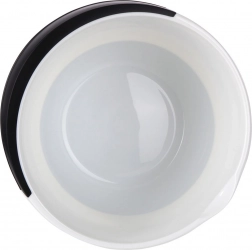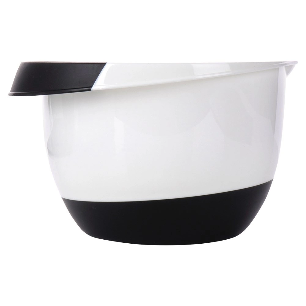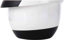 A fekete gumitalp megakadályozza a csúszkálást a munkafelületen, az oldalsó fülek pedig megkönnyítik a kezelést még teli tál esetén is.