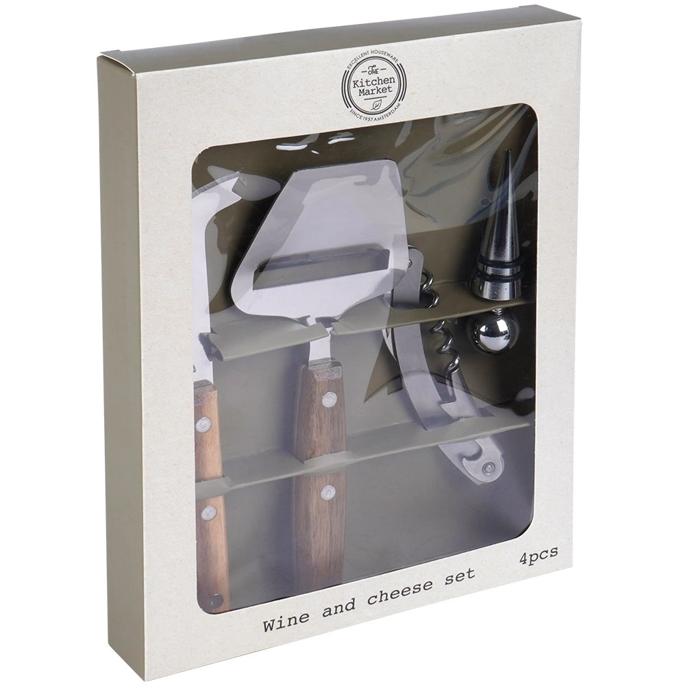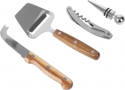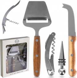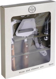 Ez az univerzális bor- és sajtkiegészítő készlet egyesíti a minőséget, funkcionalitást és időtálló dizájnt. A dugóhúzó gyors és biztonságos palacknyitást, valamint a koronazárak eltávolítását biztosítja, a záródugó megőrzi a felbontott palackok frissességét és aromáját. A sajtkés és a szeletelő precíz vágást tesz lehetővé a lágytól a kemény sajtokig.