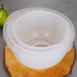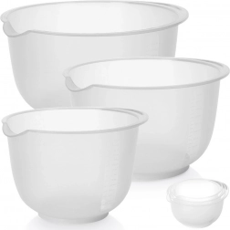 Ez a kiváló minőségű, félig áttetsző műanyagból készült konyhai tálkészlet a legtöbb konyhai feladatra megoldást kínál – a tésztakeveréstől és krémhabosítástól kezdve egészen a salátakészítésig. A tálak könnyen egymásba illeszthetők, így helyet spórolnak a szekrényben, a falon lévő mérce pedig pontos kimérést tesz lehetővé folyékony és szilárd alapanyagoknál egyaránt.