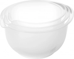Univerzális, három darabból álló konyhai tálkészlet 1,5 l, 2 l és 2,5 l űrtartalommal a mindennapi ételkészítéshez. Mindegyik tál rendelkezik praktikus kiöntőcsőrrel, beépített mércével és kényelmes fogantyúval. A csúszásmentes talpnak köszönhetően munka közben stabilak, könnyűek, strapabíróak, és mosogatógépben moshatók is.