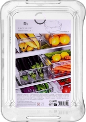 Praktikus, átlátszó hűtőszervező 27 × 19 × 11,5 cm méretben, amely segít rendezetten tartani az élelmiszereket. Beépített fogantyúinak köszönhetően könnyen hordozható és kihúzható a polcokról. Tartós, élelmiszerbiztonságos műanyagból készült, mosogatógépben is tisztítható. Ideális gyümölcsökhöz, zöldségekhez és egyéb konyhai kellékekhez. Átlátszó kivitel, masszív szerkezet, könnyű karbantartás és kényelmes fogantyúk a mindennapi használathoz.