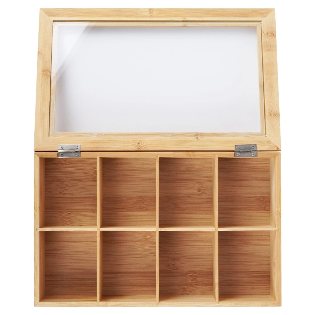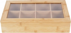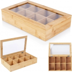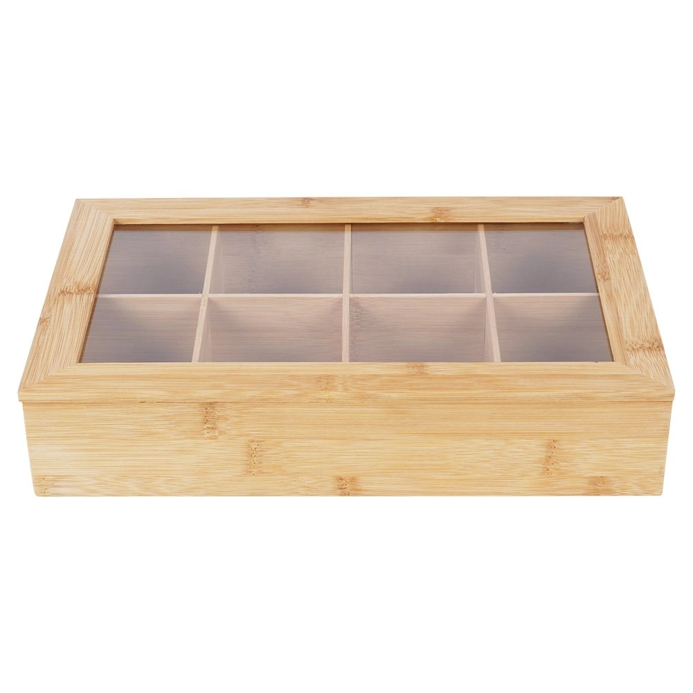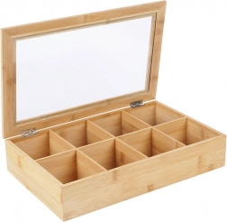 Elegáns bambusz teásdoboz 8 rekesszel és átlátszó fedéllel, amely rendezetten tartja kedvenc teáit, és tovább frissen és illatosan őrzi őket. A természetes bambusz nedvességálló, nem deformálódik és nem veszi át a szagokat, így ideális a konyhába és vendéglátóhelyekre is.