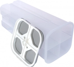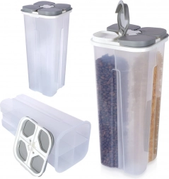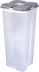 Praktikus, 3 liter űrtartalmú szárazélelmiszer-tartály négy különálló rekesszel és független kiöntő fedélkékkel. A átlátszó testnek köszönhetően mindig látható a tartalom, a profilozott forma megkönnyíti a kezelést, a tömítő fedél pedig véd a nedvességtől. Ideális liszthez, cukorhoz, rizshez, tésztához, müzlihez és más száraz alapanyagokhoz.