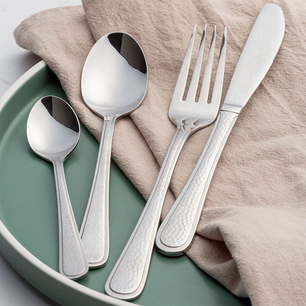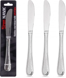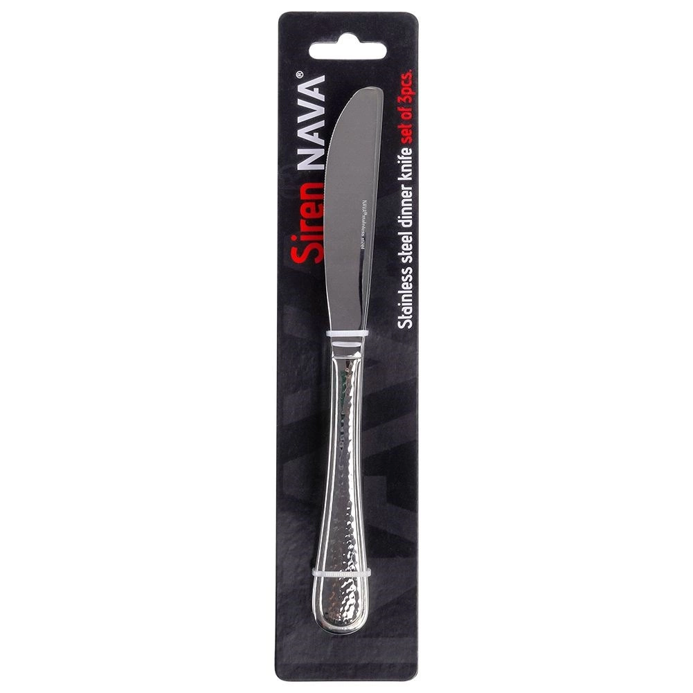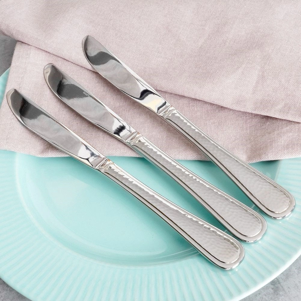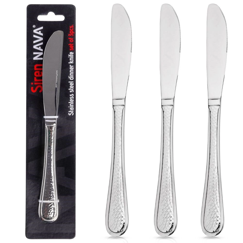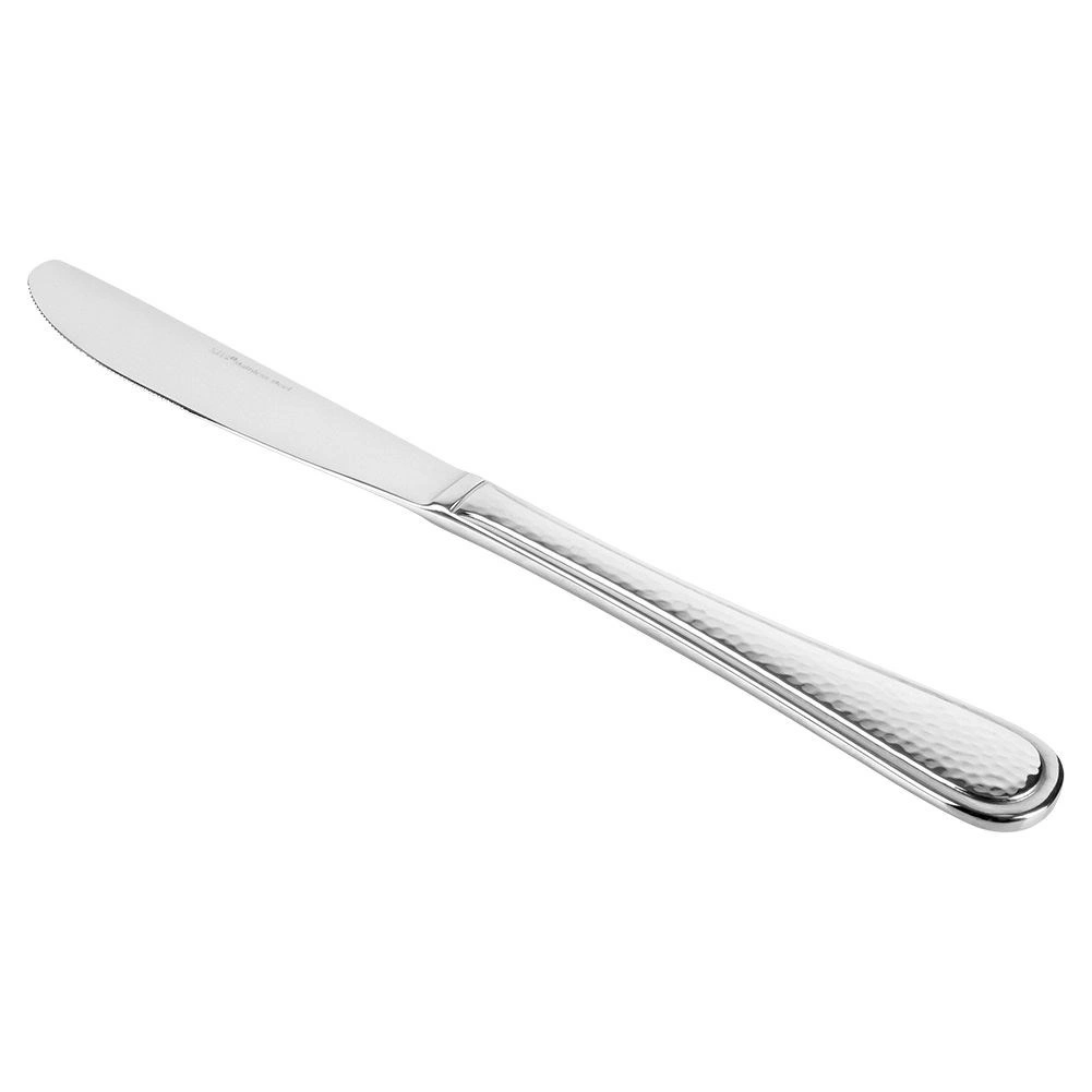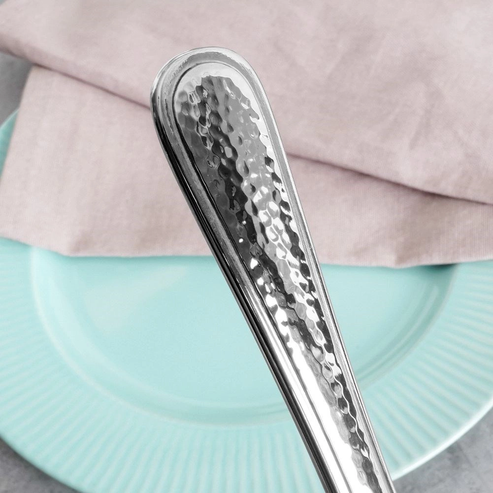 Elegáns, három darabból álló étkezési késkészlet polírozott rozsdamentes acélból, kovácsolt (kalapált) felület hatásával. Klasszikus dizájnt, hosszú élettartamot és mosogatógépben könnyű tisztítást kínál – ideális mindennapi étkezéshez és ünnepi alkalmakra is.
